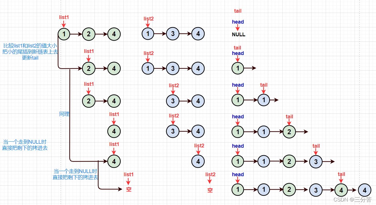 struct ListNode* mergeTwoLists(struct ListNode* list1, struct ListNode* list2){ //检查list1或list2一开始就为NULL的情况 if(list1==NULL) { return list2; } if(list2==NULL) { return list1; } struct ListNode*head=NULL; struct ListNode*tail=head; while(list1&&list2) { if(list1->val<list2->val) { if(tail==NULL) { head=tail=list1; } else { tail->next=list1; tail=list1; } list1=list1->next; } else { if(tail==NULL) { head=tail=list2; } else { tail->next=list2; tail=list2; } list2=list2->next; } } //当list1和list2其中一个走到空的情况 if(list1==NULL) { tail->next=list2; } else { tail->next=list1; } return head; }**法二:**哨兵位的头节点