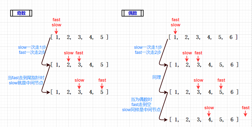 这道题要注意奇偶数,如果为奇数,如示例1,那么中间节点值就是3,反之偶数如示例2,返回第二个中间节点。此题我们定义两个指针slow和fast都指向第一个数据的位置,区别在于让slow一次走1步,fast一次走2步。当fast走到尾指针时,slow就是中间节点