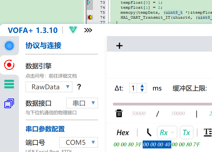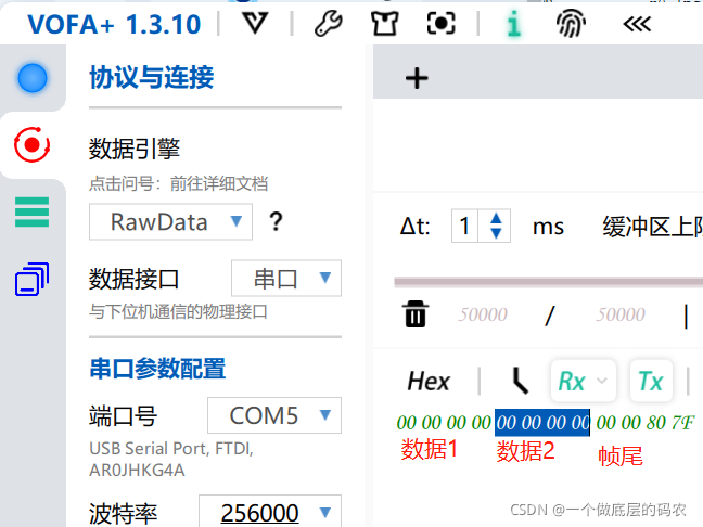 当我配置发送“0”和“0”数据时,上位机收到数据如图。00 00 80 7F为帧尾。