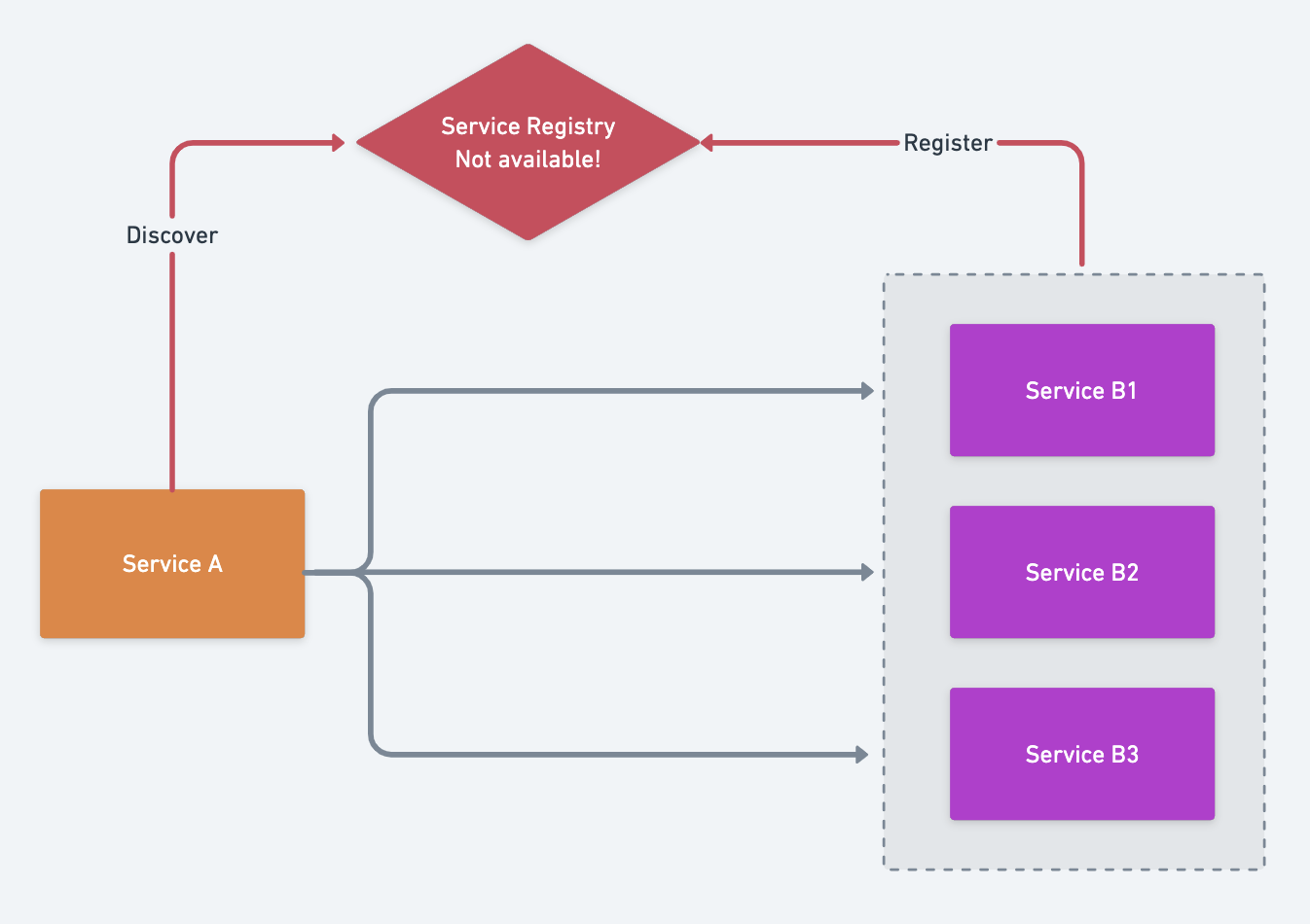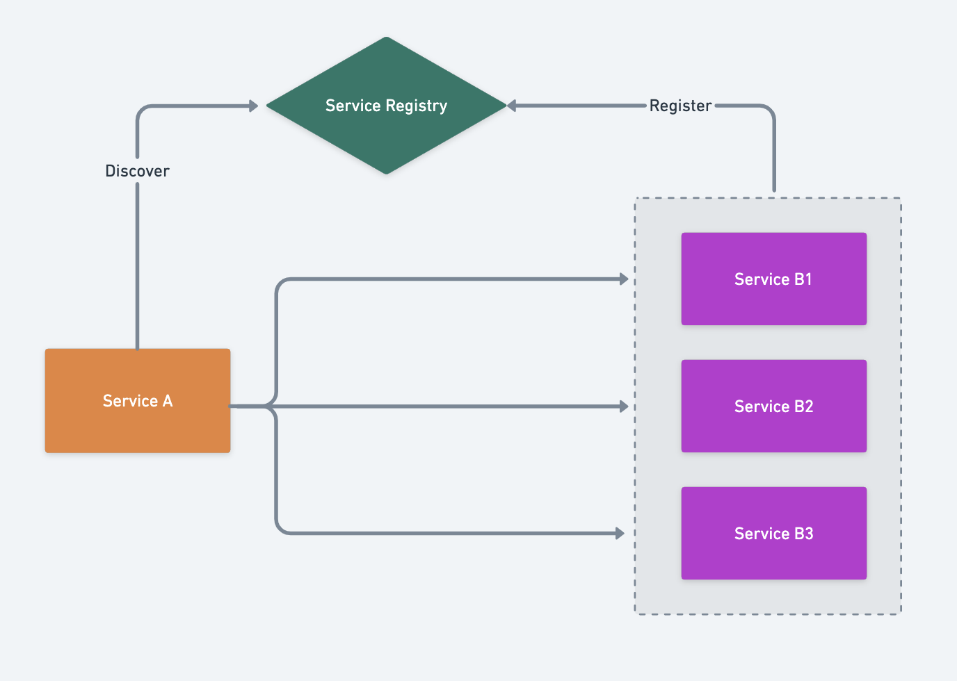 当 Service A 启动时,需要从 Service Registry 获取 Service B 的已有节点列表:Service B1, Service B2, Service B3,然后根据自己的负载均衡算法来选择合适的节点发送请求。