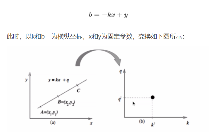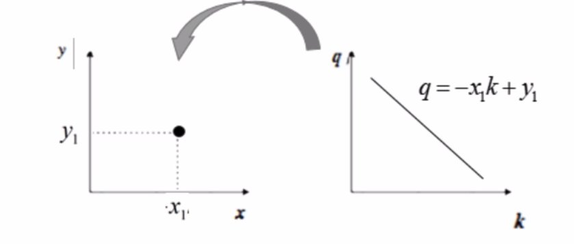 从上图可以看出,在直角坐标系下的一个直线,在变换后的空间中仅仅表示为一点,对于变换后的空间,我们称其为霍夫空间。也就是说,直角坐标系下的一条直线对应了霍夫空间中的一个点。类似的,霍夫空间中的一条直线也对应了直角坐标系中的一个点,如下图所示: