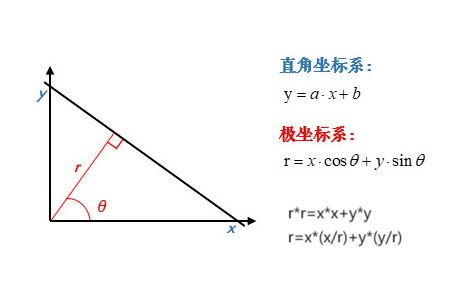 然而对于x=1这种直线来说,y已经不存在了,那么就没办法使用上面的方法进行检测了,为了解决这个问题,我们就将直角坐标系转化为极坐标系,然后通过极坐标系与霍夫空间进行相互转化。