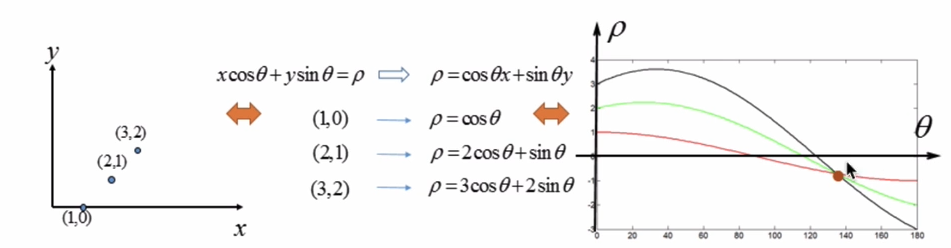在极坐标系下是一样的,极坐标中的点对于霍夫空间中的线,霍夫空间中的点对应极坐标中的直线。并且此时的霍夫空间不再是以k为横轴、b为纵轴,而是以为θ横轴、ρ(上图中的r)为纵轴。上面的公式中,x、y是直线上某点的横纵坐标(直角坐标系下的横纵坐标),和是极坐标下的坐标,因此我们只要知道某点的x和y的坐标,就可以得到一个关于θ-ρ的表达式,如下图所示: