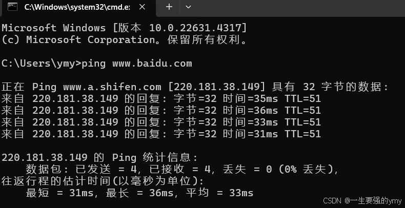 进行此操作来检测和百度服务器的连接。补充一点,因为输入域名时计算机会通过DNS协议将域名解析为对应的IP地址,所以ping之后可以加域名或IP。