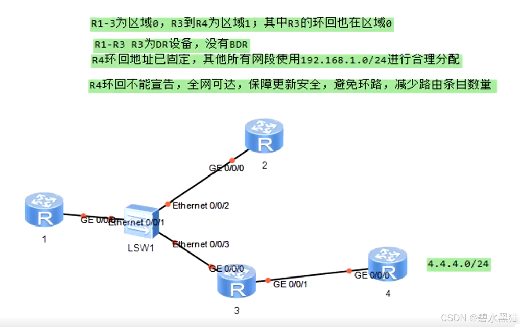 切结:DR/BDR设备的选举是非抢占性质;故需要网段内部重新进行选举,需要重启该网段内的所有参选设备的OSPF进程;若参选接口的优先级为0,则默认放弃参选;一个网段中至少应该存在一台DR设备。