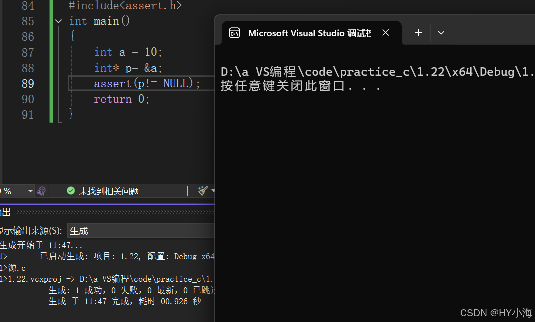 使用 assert()的好处:它不仅能自动标识文件和出问题的行号,还有一种无需更改代码就能开启或关闭 assert()的机制。如果已经确认程序没有问题,不需要再做断言,就在#include<assert.h>语句的前面,定义一个宏NDEBUG
