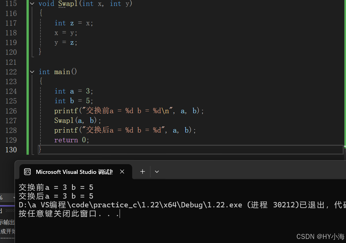 原因:实参(a,b)传递给形参(x,y)的时候,形参是实参的一份临时拷贝,形参有自己独立的空间,对形参的修改是不会影响实参的。