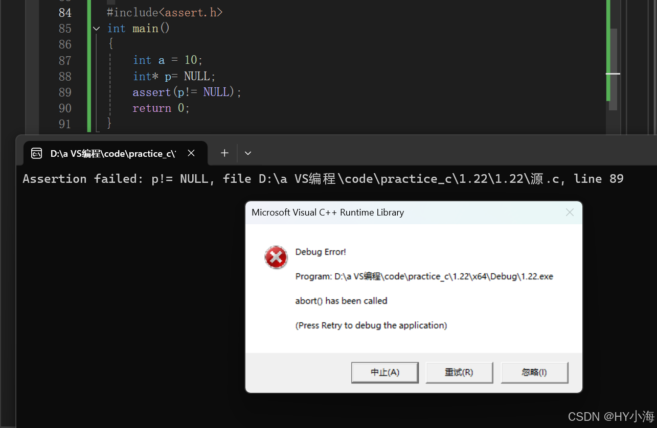 上面代码在程序运行到这一行语句时,验证变量 p是否等于 NULL。如果确实不等于 NULL,程序继续运行,否则就会终止运行,并且给出报错信息提示。