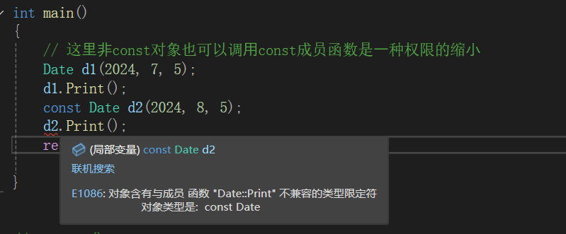 const实际修饰该成员函数隐含的this指针,表明在该成员函数中不能对类的任何成员进行修改。 const 修饰Date类的Print成员函数,Print隐含的this指针由 Date* const this 变为 const Date* const this