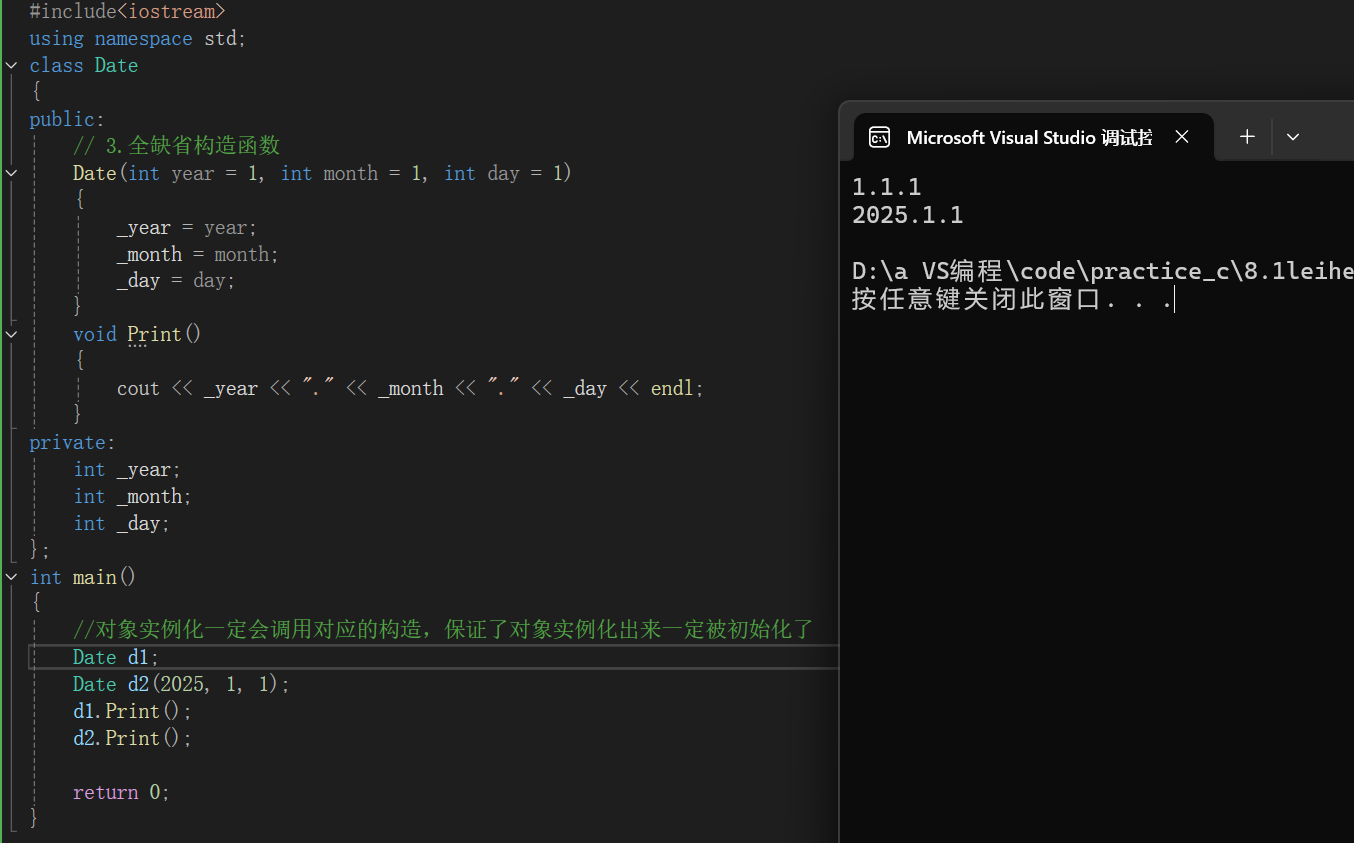- 无参构造函数、全缺省构造函数、我们不写构造时编译器默认生成的构造函数,都叫做默认构造函 数。但是这三个函数有且只有⼀个存在,不能同时存在。无参构造函数和全缺省构造函数虽然构成 函数重载,但是调用时会存在歧义。要注意很多同学会认为默认构造函数是编译器默认生成那个叫 默认构造,实际上无参构造函数、全缺省构造函数也是默认构造,总结⼀下就是不传实参就可以调 用的构造就叫默认构造。