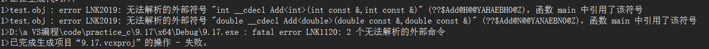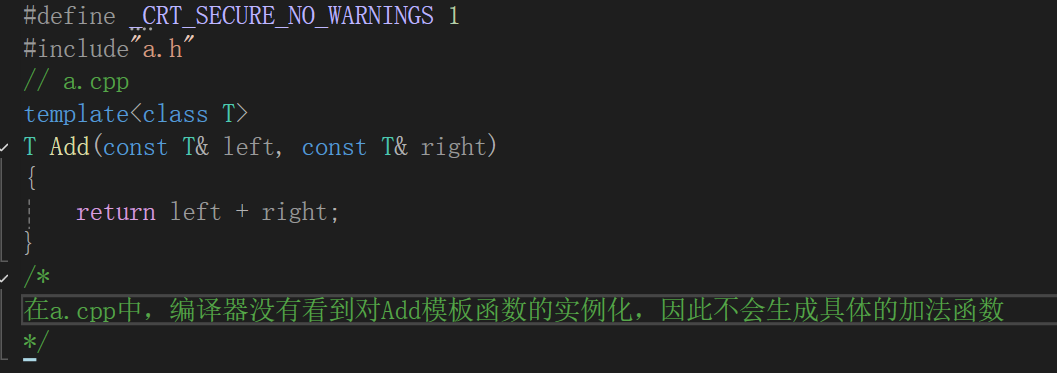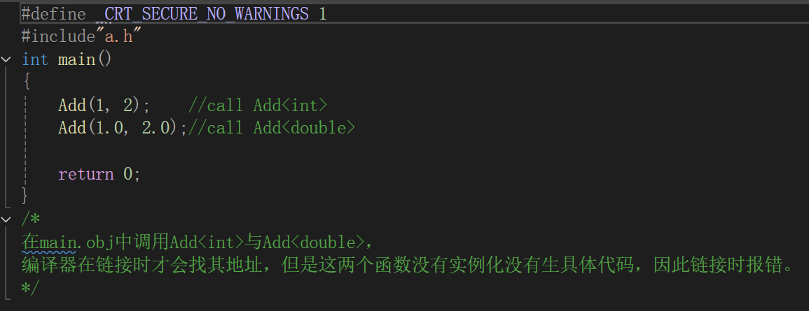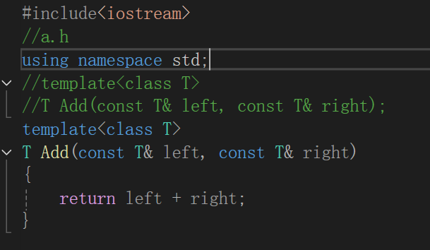 假如有以下场景,模板的声明与定义分离开,在头文件中进行声明,源文件中完成定义: