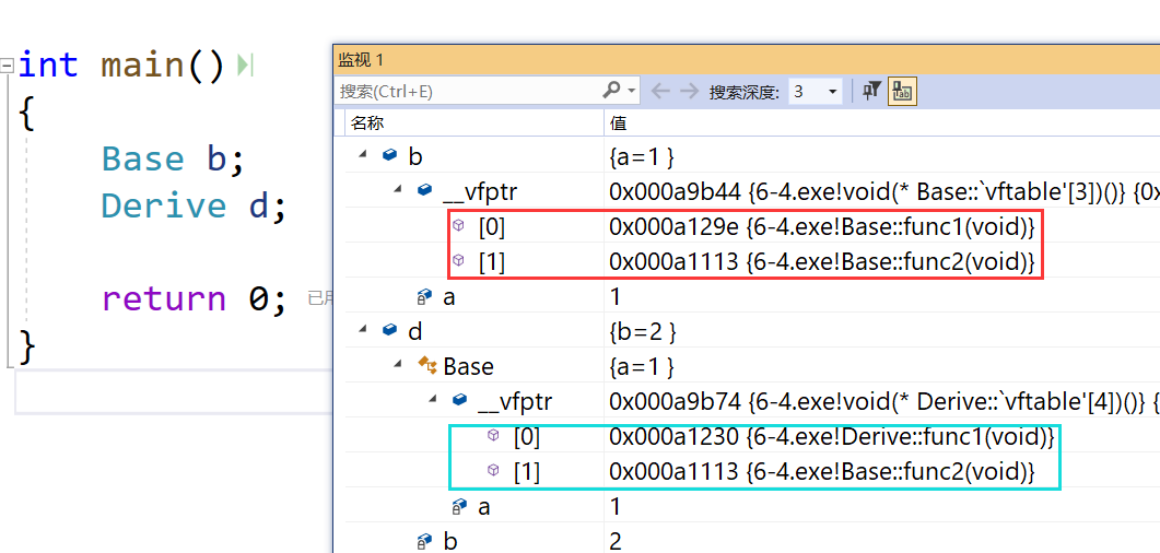 - 基类对象的虚函数表中存放基类所有虚函数的地址。同类型的对象共用同一张虚表,不同类型的对象各自有独立的虚表,所以基类和派生类有各自独立的虚表。