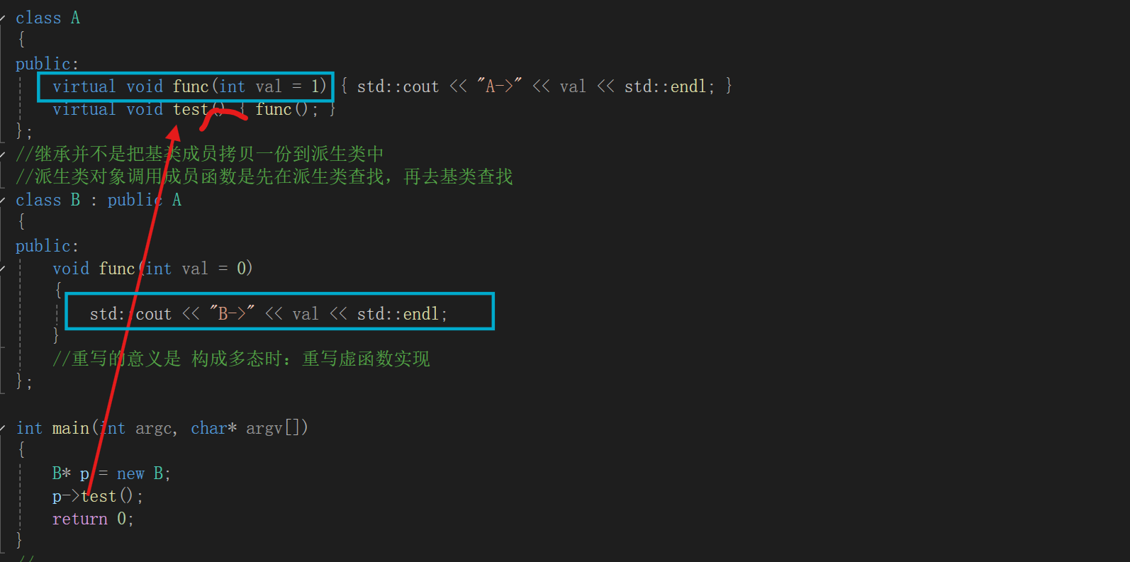 virtual void func(int val = 1) { std::cout << "A->" << val << std::endl; }