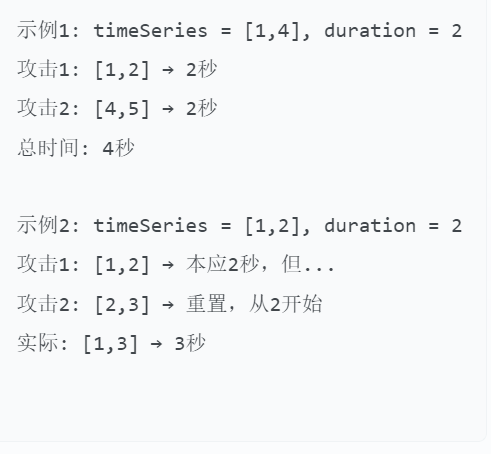 输入:timeSeries = [1,2], duration = 2输出:3时间线:1(中毒) 2(中毒) 3(中毒) - 第2秒攻击重置了计时器
