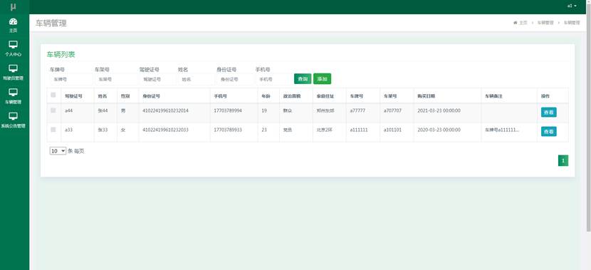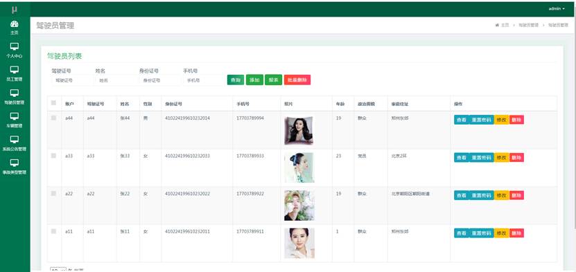 管理员模块主要负责系统基础数据管理和用户管理,下面是驾驶员管理功能的核心代码:
