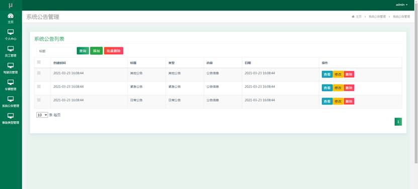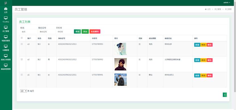 员工模块主要负责日常运营数据的录入和管理,下面是车辆管理功能的部分实现: