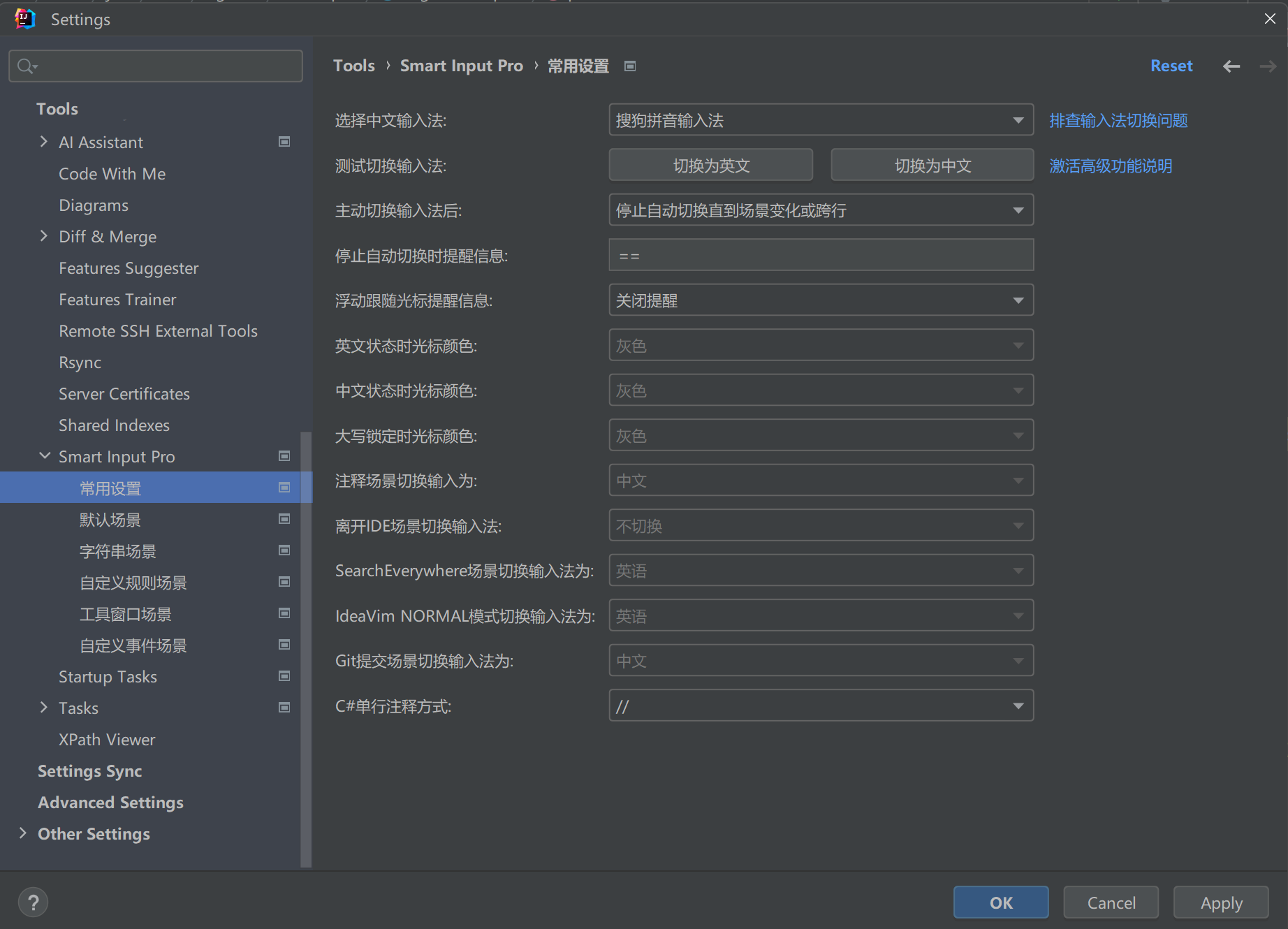 在IDEA中有看一款叫Smart Input Pro的插件,主要作用是在写中文注释的时候可以自动切换输入法到中文,还有很多支持自定义的东西,狠狠推荐一波。