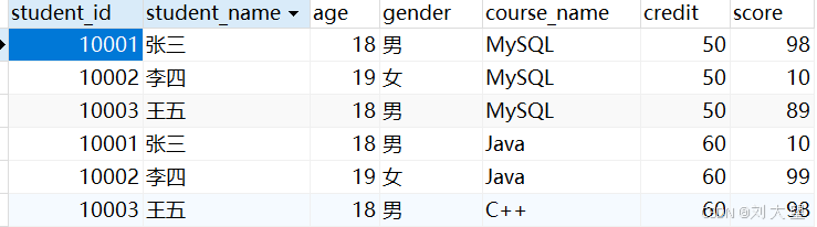 学生的姓名、年龄、性别和课程的学分在每行记录中重复出现,造成了大量的数据冗余。