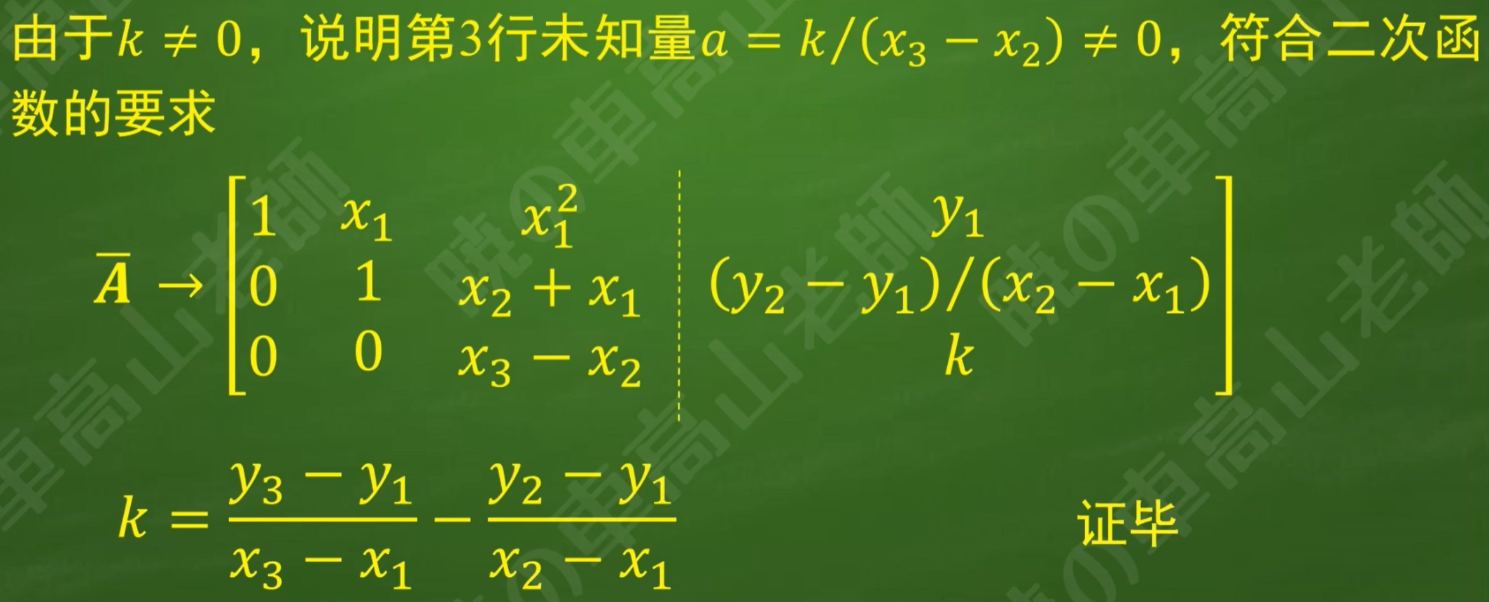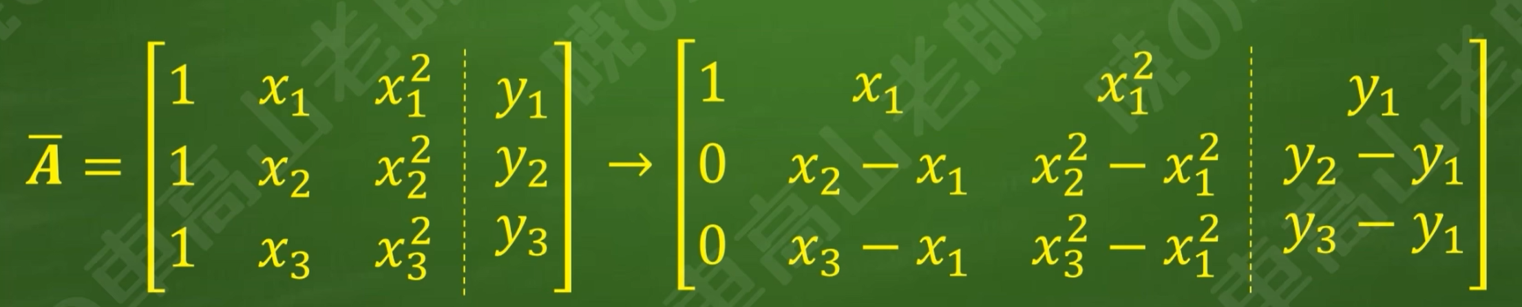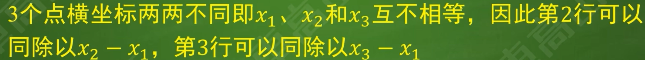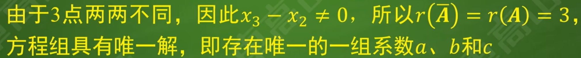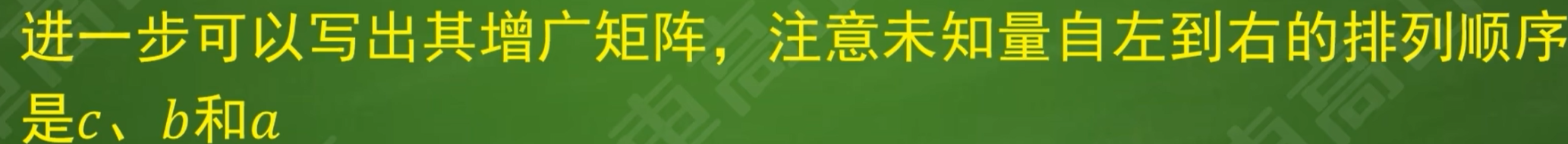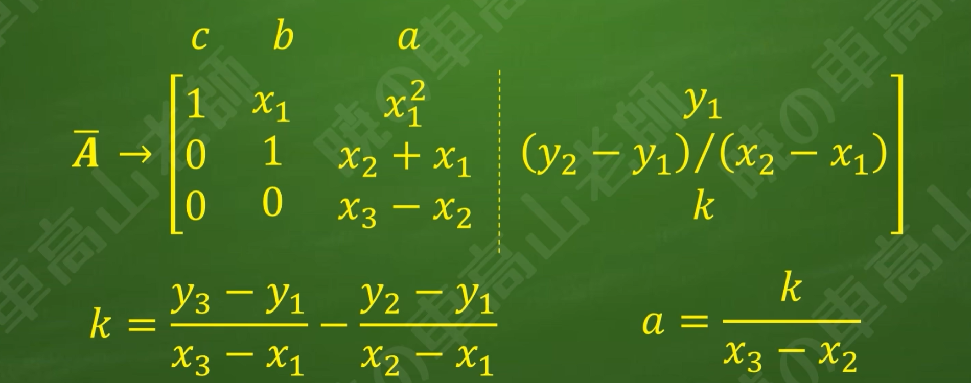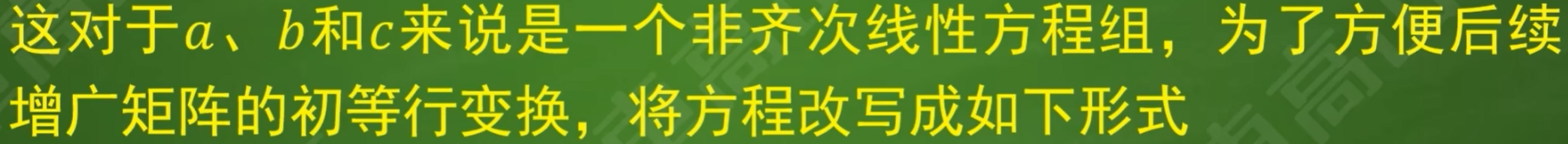 注:x1,y1,x2,y2,x3,y3皆为已知,a,b,c为未知数,则关于a,b,c的三元一次方程组,三点不共线y1,y2,y3不相等,因此一定是非齐次方程组