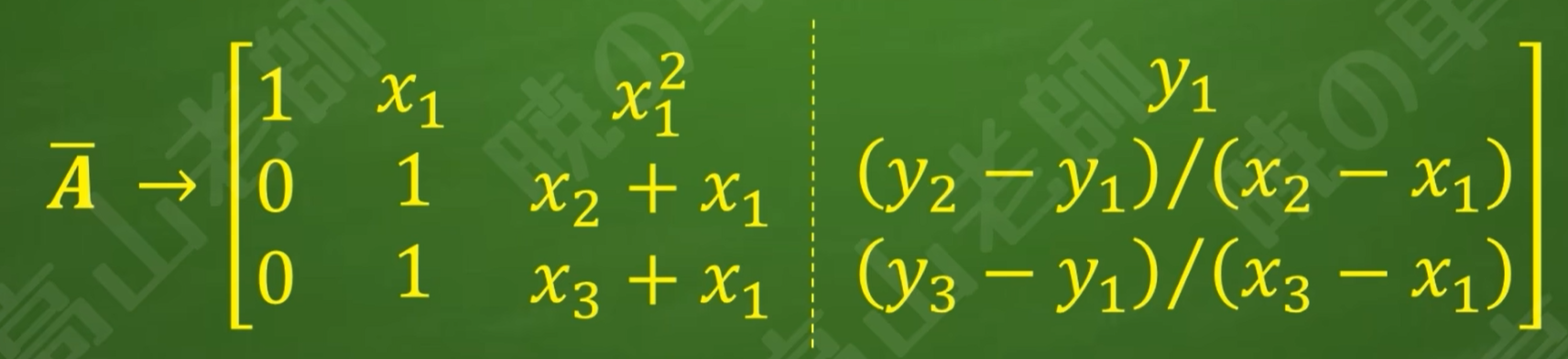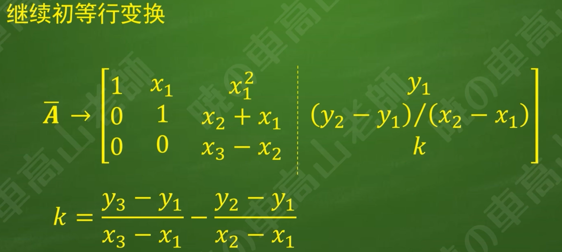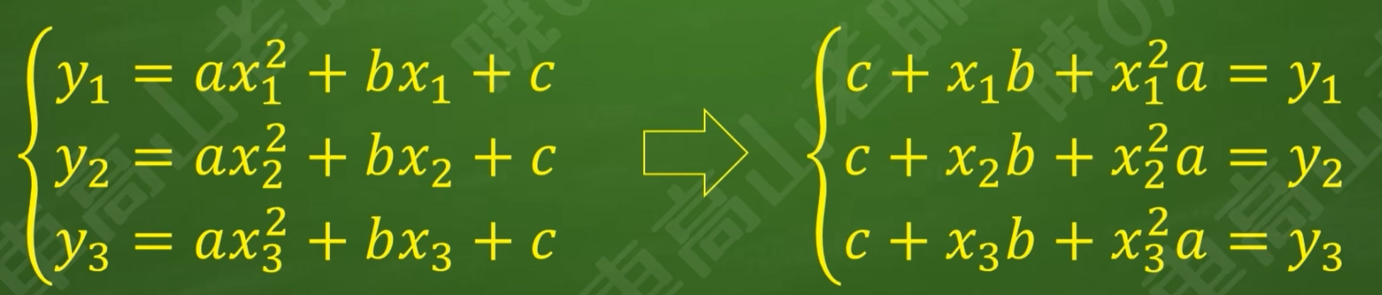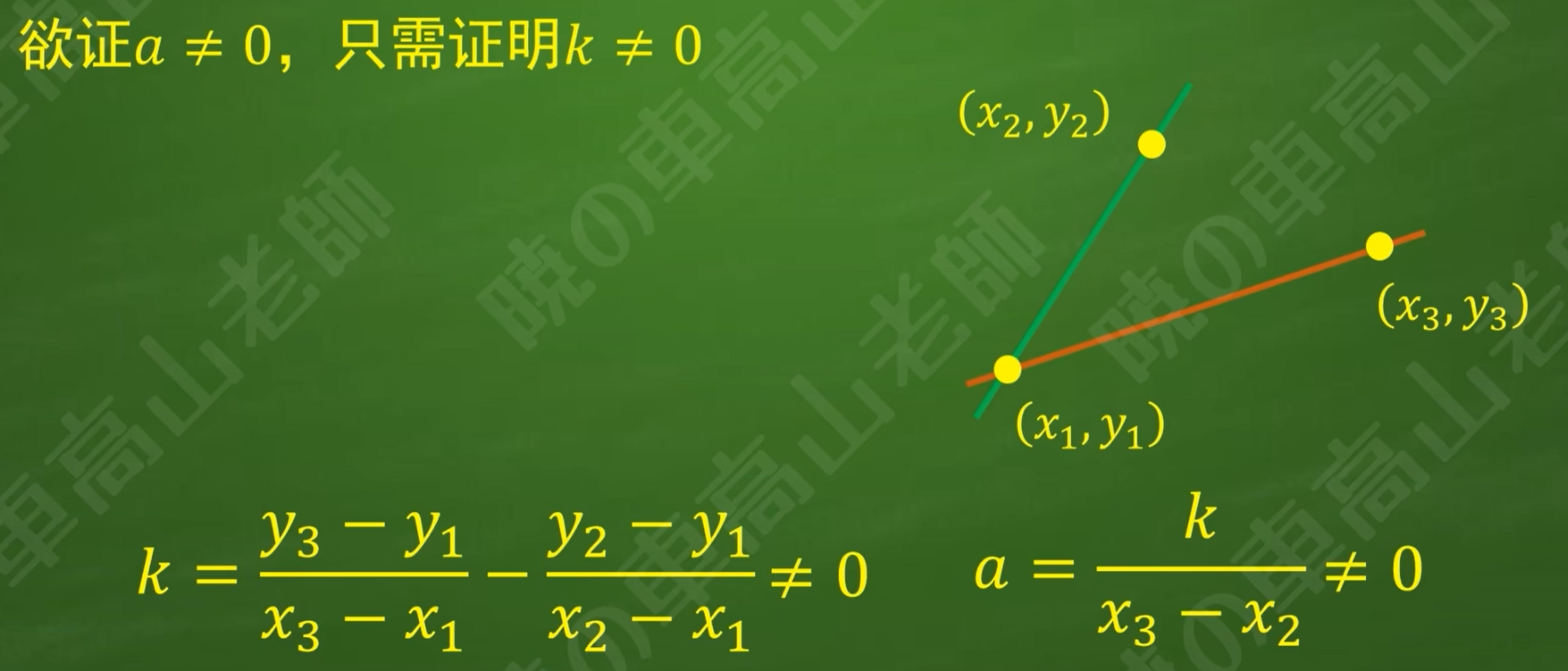 注:x1,y1,x2,y2,x3,y3皆为已知,a,b,c为未知数,则关于a,b,c的三元一次方程组,三点不共线y1,y2,y3不相等,因此一定是非齐次方程组
