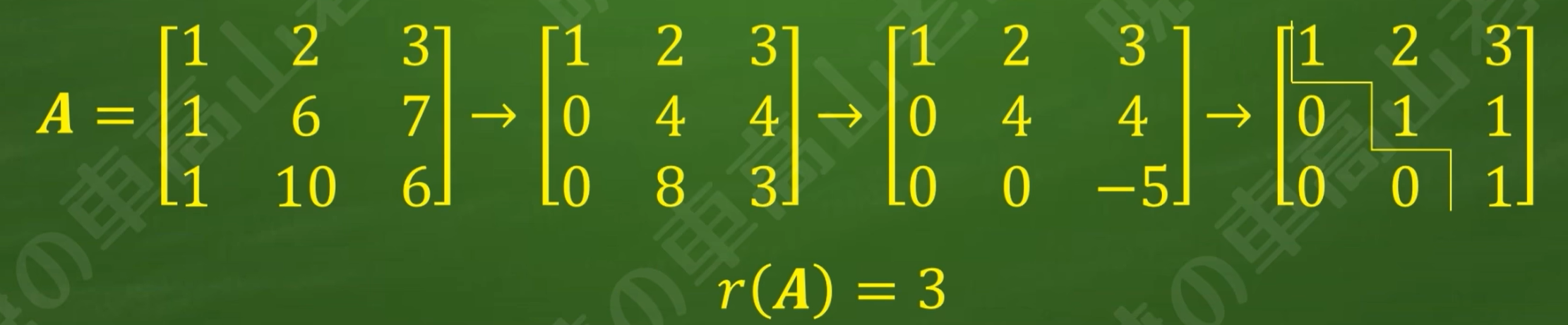 (1)对于矩阵A,将其经过初等行变换后变为阶梯矩阵,阶梯矩阵的非零行数就是矩阵A的秩(Rank),记为r(A)。