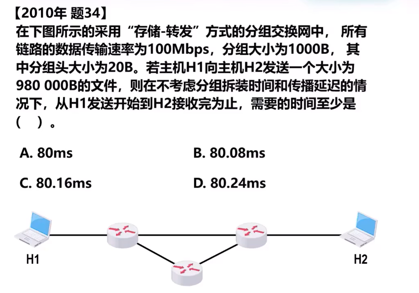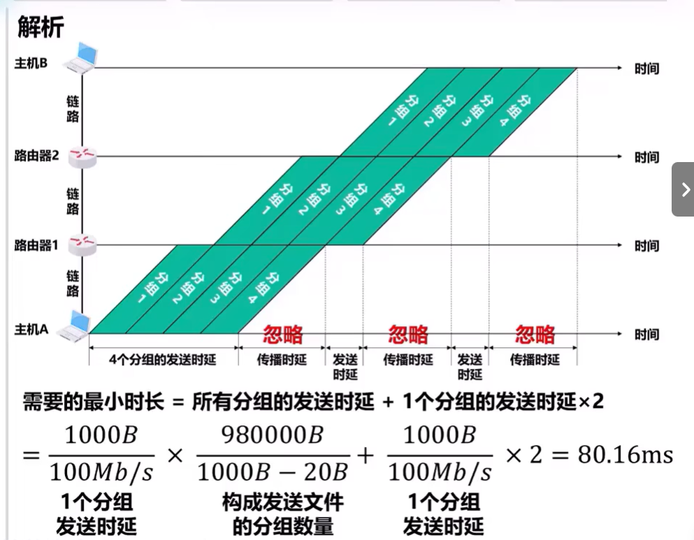 解析:先明确分组交换中“存储——转发”的时间逻辑:每个分组的传输时间(从发送到接收)取决于分组在链路上的传输,且“存储——转发”要求一个分组必须完全到达路由器后,才能开始向下一个链路传输。