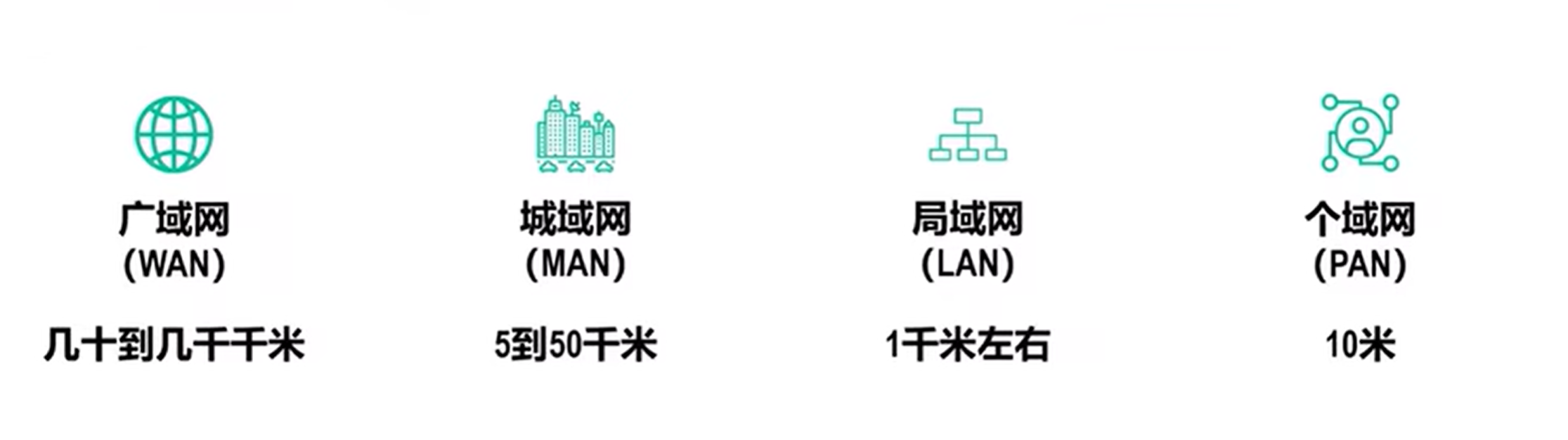 城域网(MAN):5-50千米,城市骨干网,互连大量机构 企业以及校园局域网。