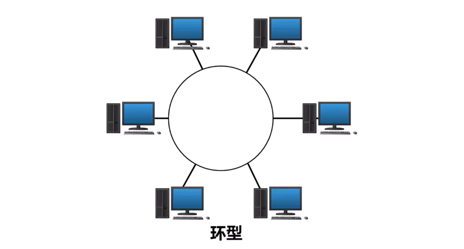 环型:所有计算机的网络接口都连接成一个环,最典型的例子是令牌环局域网,环可以是单环也可以是双环,环中信号是单向传输的。