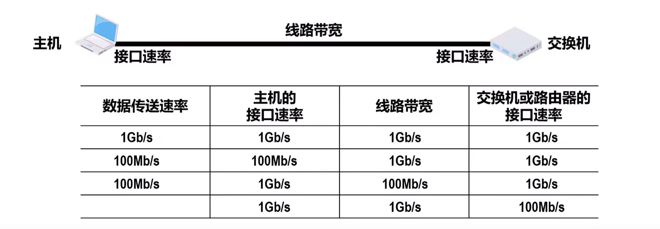 数据传送速率=min[主机接口速率,线路带宽,交换机或路由器的接口速率]