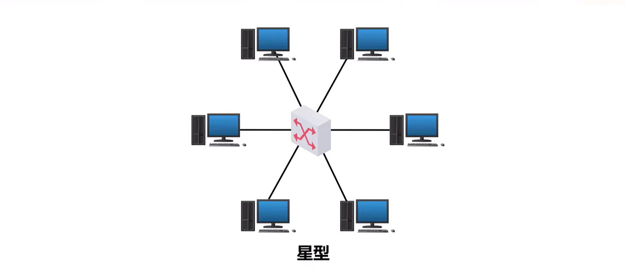 星型:每个计算机都以单独的线路与中央设备相连,中央设备早期是计算机,后来是集线器,现在一般是交换机或路由器,这种网络拓扑的优点是便于网络的集中控制和管理,缺点是成本高,中央设备对故障敏感。