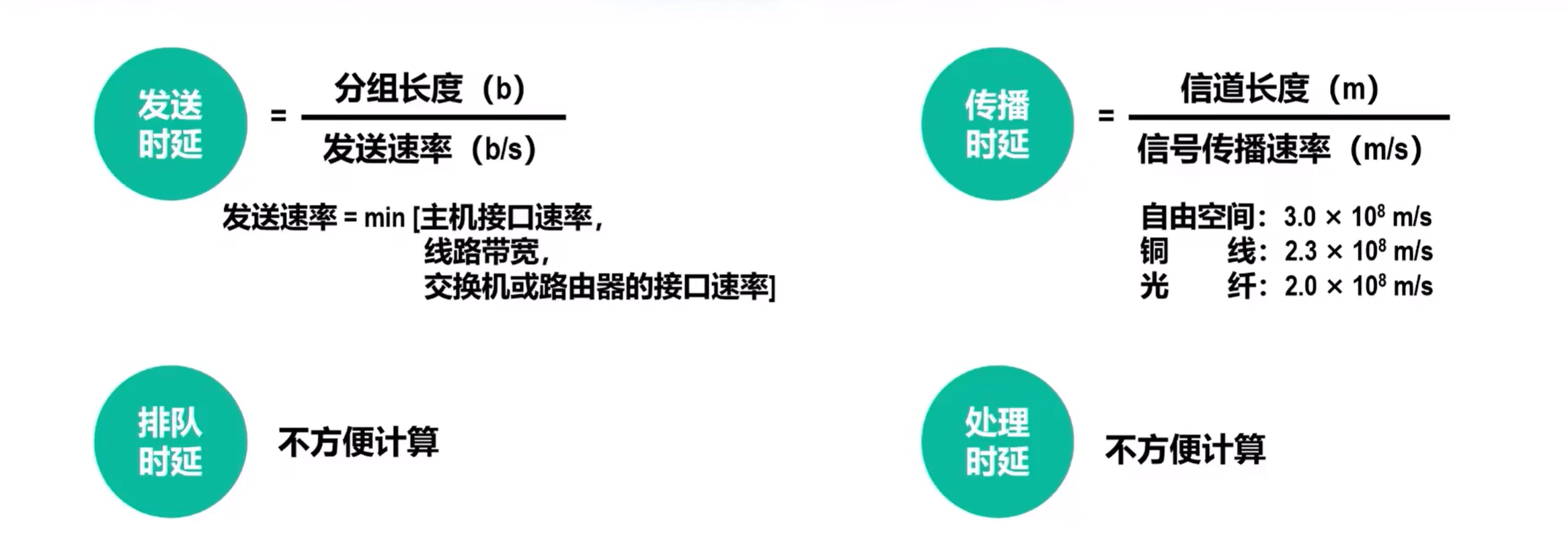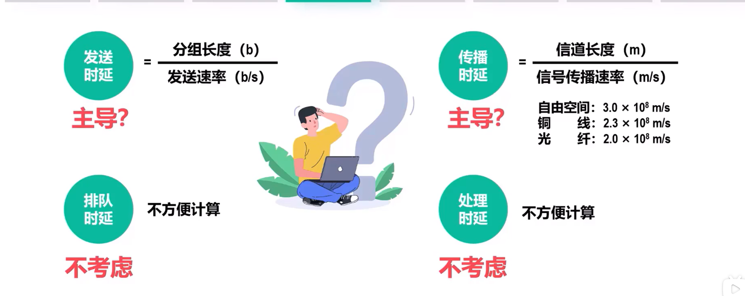 确定传播时延是应该先确定是什么传输媒体,进而可以确定电磁波在该传输媒体中的传播速率,视频中希望同学将上述三种常见的速率记住,我尽量吧。