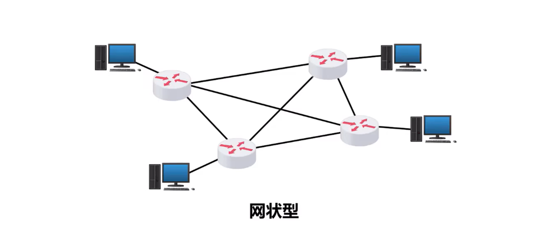网状型:一般情况下,每个节点至少有两条路径与其他节点相连,多用在广域网中,其优点是可靠性高,缺点是控制复杂,线路成本高。