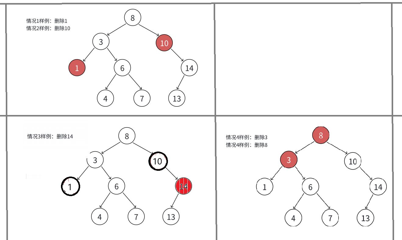 首先查找元素是否在二叉搜索树中,如果不存在,则返回false。如果查找元素存在则分以下四种情况分别处理:(假设要删除的结点为N)