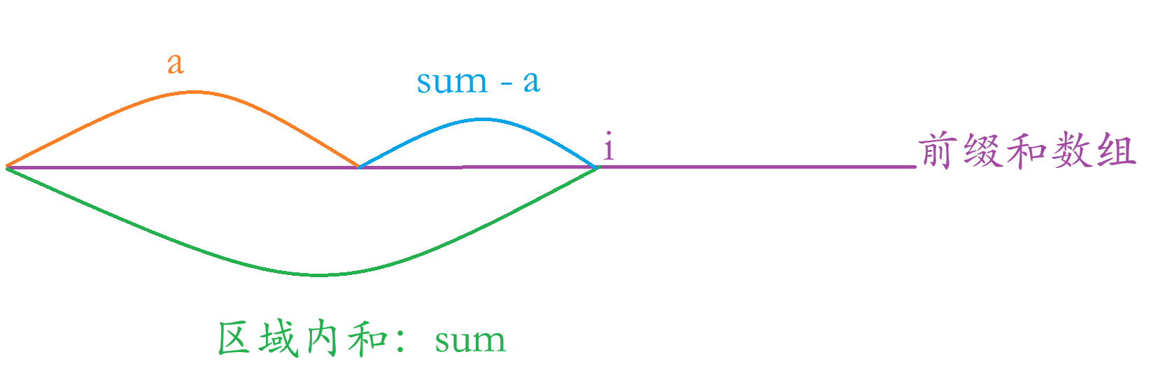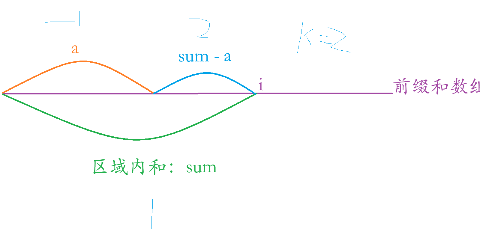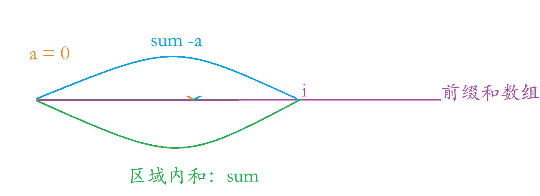 看这张图片,假设我们求数组区域内的和来到 i,到 i 点区域内的和为 sum,我们要判断 sum - a 区域的和是否 % k 是否等于 0,因为原数组的子数组有可能从下标为 0 开始到 i 这里的和%k 是不等于0,0 到 i 点内的里面的子数组是有可能是 % k 是等于0,所以sum - a 就是包含这种情况的所有集合。根据我们补充的两个知识点,所以我们可以得出 (sum - a)%k = 0 => sum%k = a%k