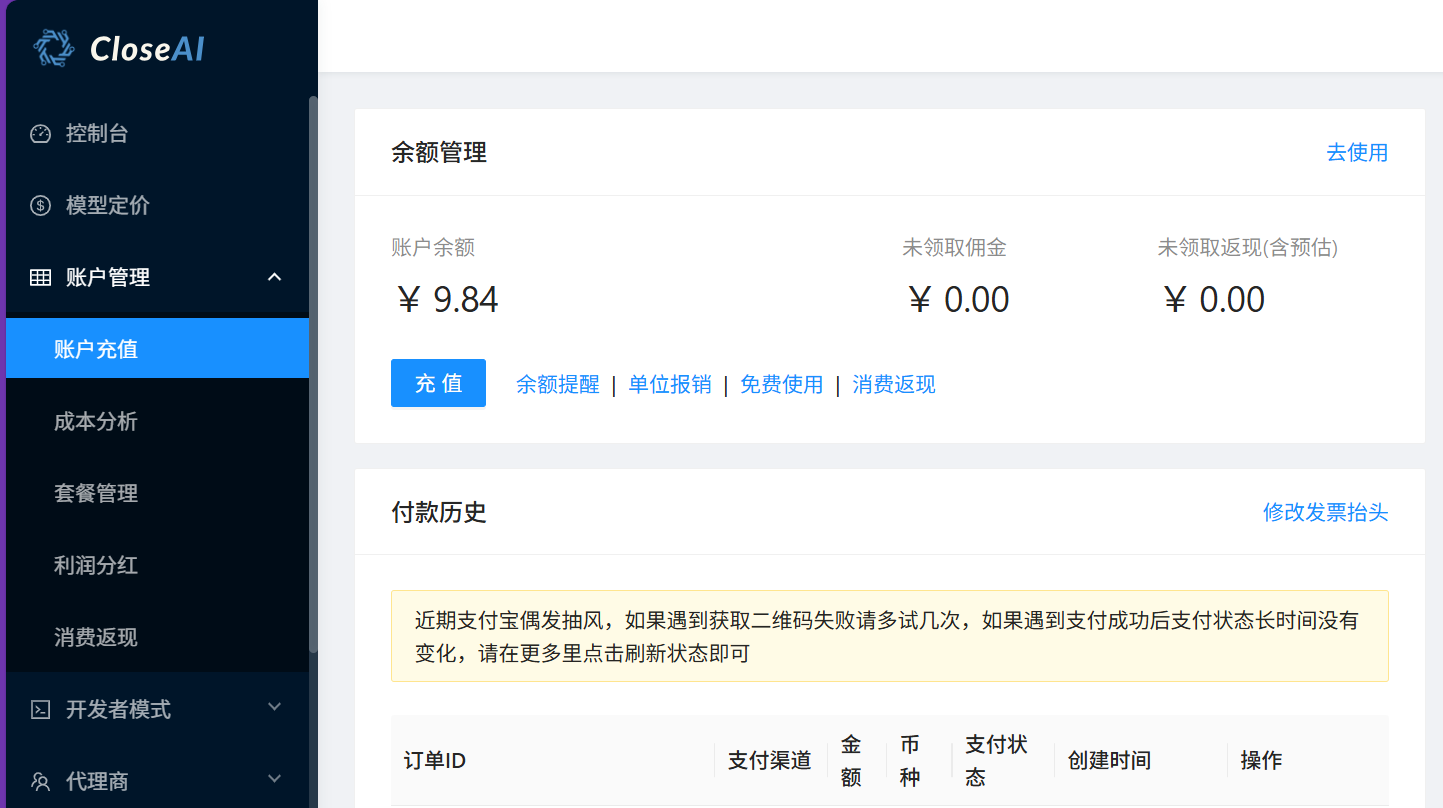 既然是“代理”,那就要收取一定的费用,我们去账户管理->账户充值,充值最小额度即可,每次调用api,就会收取一部分费用,这个费用跟ai消耗的算力和ai模型的级别有关。