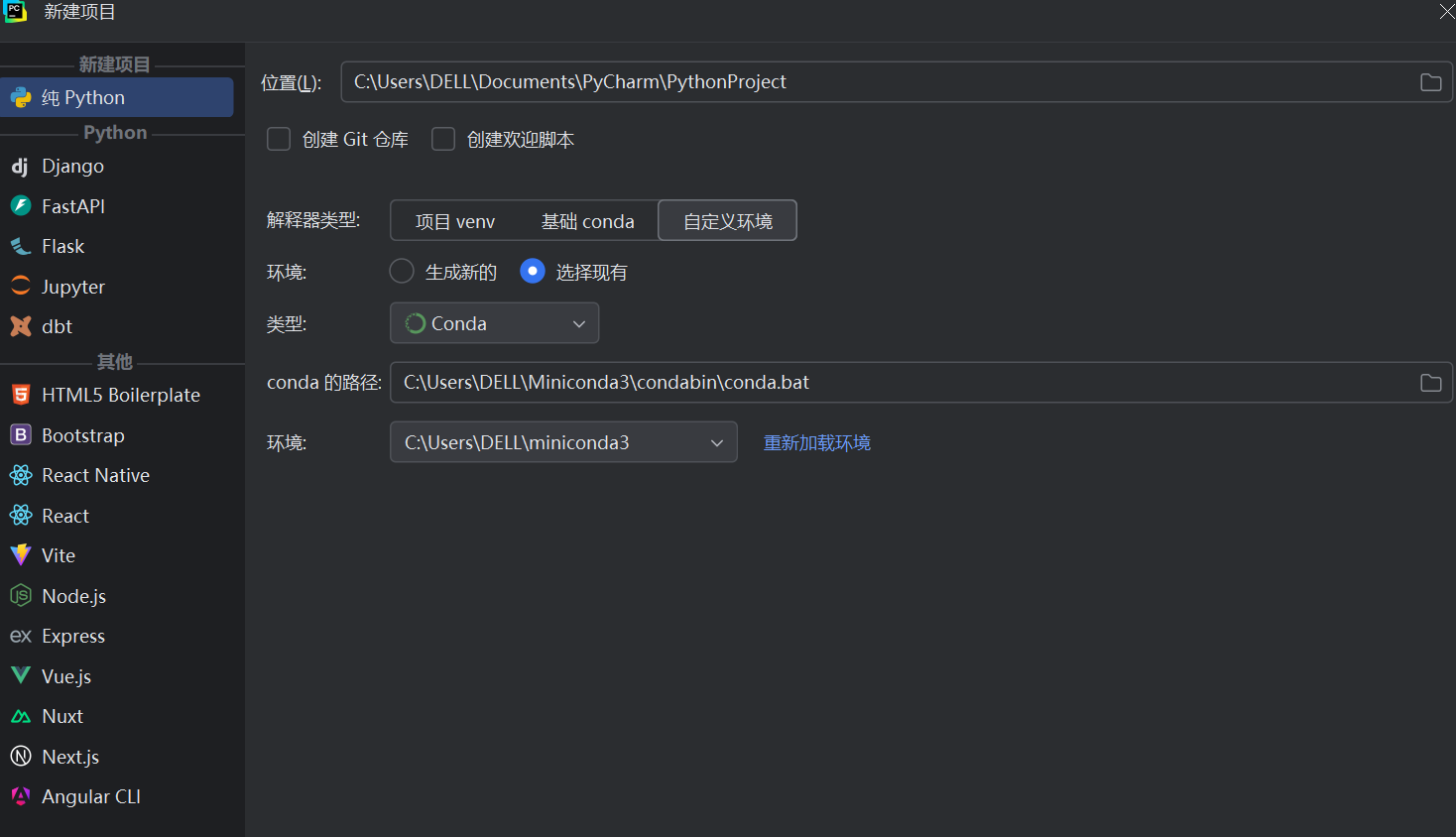 新建一个项目,注意类别要选择Conda,环境那里选择一个已经激活并安装LangChain的环境