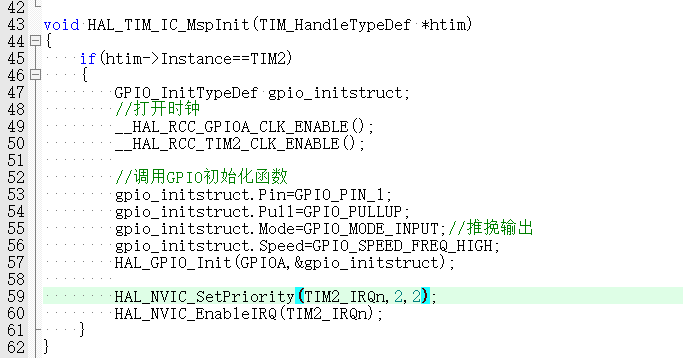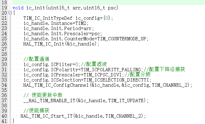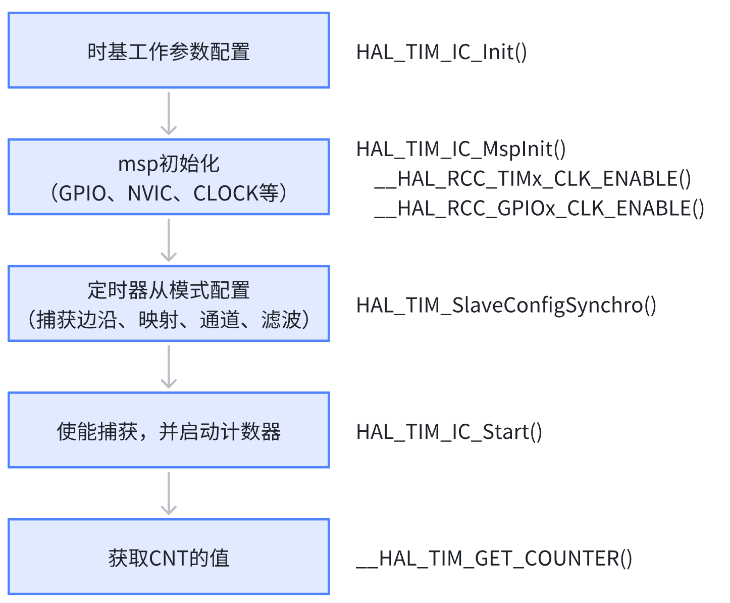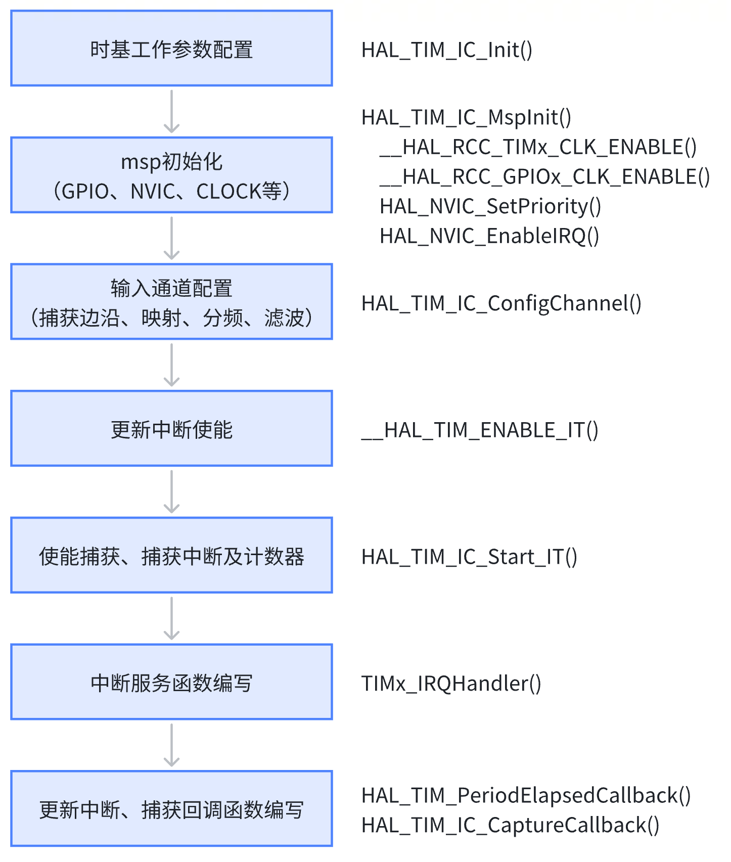 HAL_TIM_IC_MspInit回调函数初始化底层硬件(如 GPIO、时钟、中断)。
