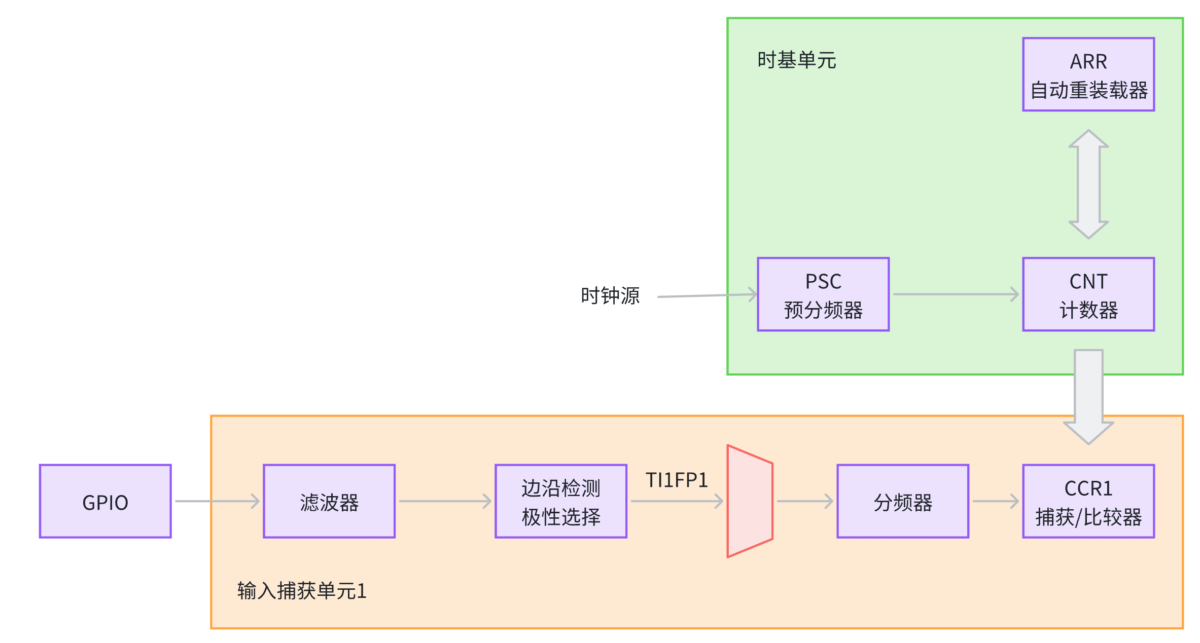 - GPIO 初始化:配置输入捕获通道对应的引脚为复用功能模式(AF)。