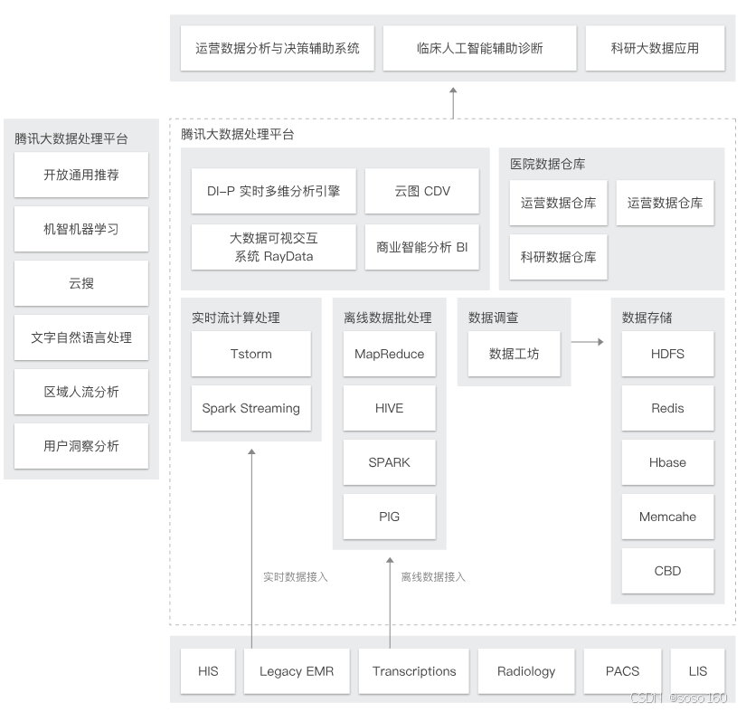 - 临床大数据:采用智能化的数据采集工具,将分散在不同化医院业务系统中异构数据源中的临床数据,经过 ETL 转换集中统一存储到临床数据中心,满足门诊、住院系统中对患者全视图的信息抽取,可随时随地了解病患的医疗数据信息,协助医务人员快速了解病情做出精准诊断。