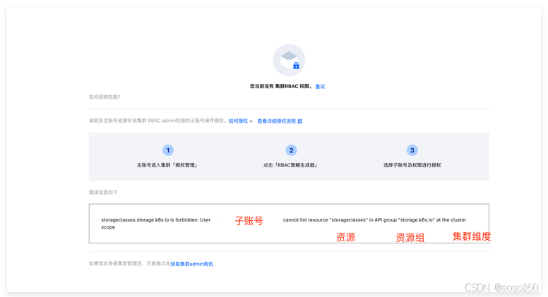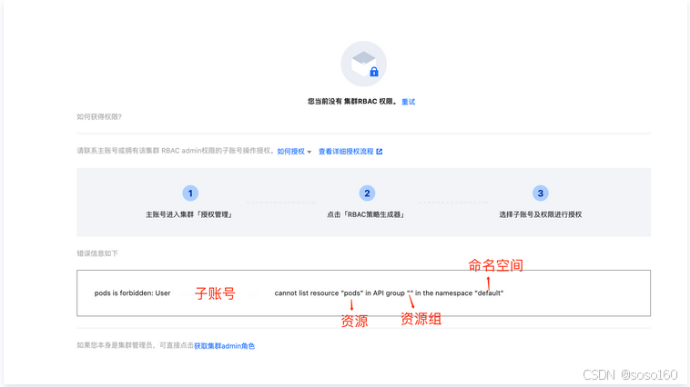 当子账号没有特定集群的 RBAC 权限并尝试获取资源时,将出现如下报错: