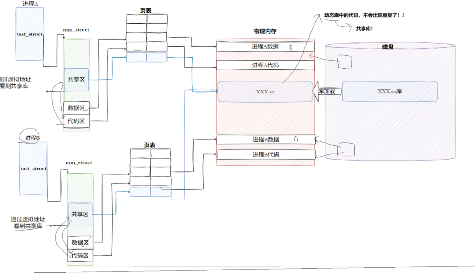 下面这张图片就是多个程序是如何访问同一个动态库的。
