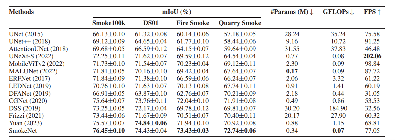 通过在四个数据集上的评估,包括新发布的采石场烟雾数据集,结果表明SmokeNet在计算效率和分割准确性之间保持良好的平衡,适合用于环境监测和安全管理系统。