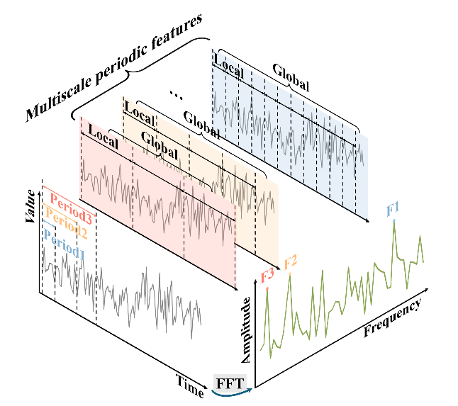 1)多尺度周期分解 提出通过傅里叶变换提取时间序列的主周期,并基于此将数据分解为多尺度周期段。不同于传统方法仅依赖固定窗口或单一周期,这种分解方式更贴合实际数据的周期性特征,能够自适应捕捉不同时间尺度下的局部模式。