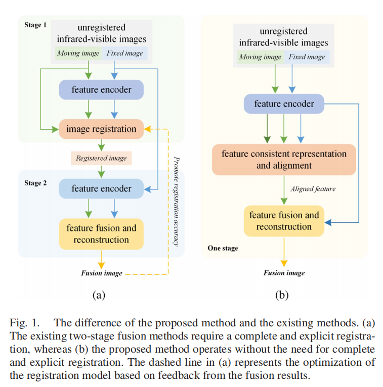 MulFS-CAP框架:提出了一种名为MulFS-CAP的单阶段融合框架,将非配准红外-可见光图像的配准和融合任务相结合。该框架利用共享浅层特征编码器,在单阶段中合并非配准的红外-可见光图像,避免了传统两阶段方法中配准和融合任务独立训练导致的性能欠佳问题。