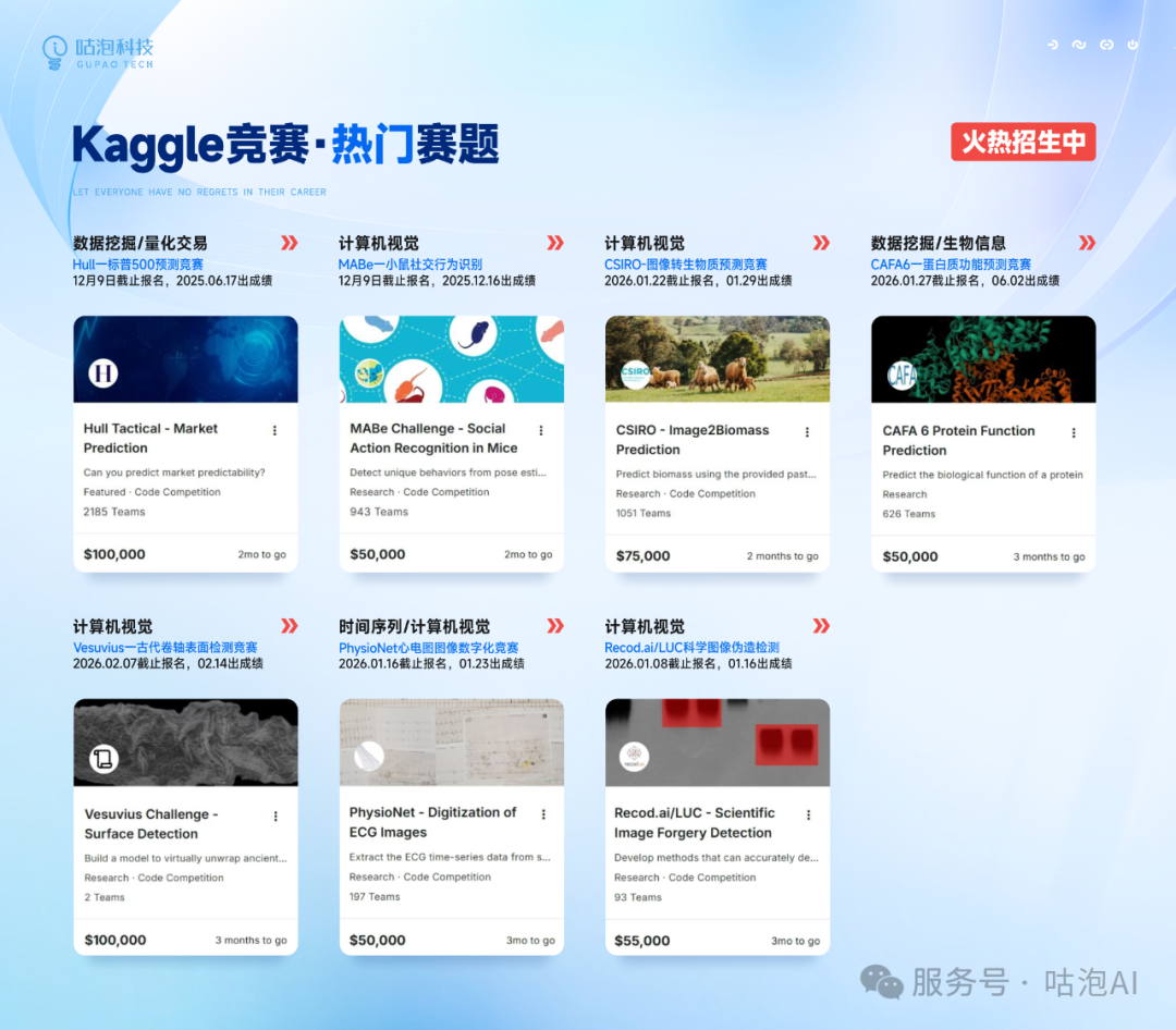 无需门槛,不限专业,不限时间和阶段,任何人都可以从零开始准备一场Kaggle比赛,提升你数据分析能力,用赛事成果反哺科研论文,并获得项目经验。