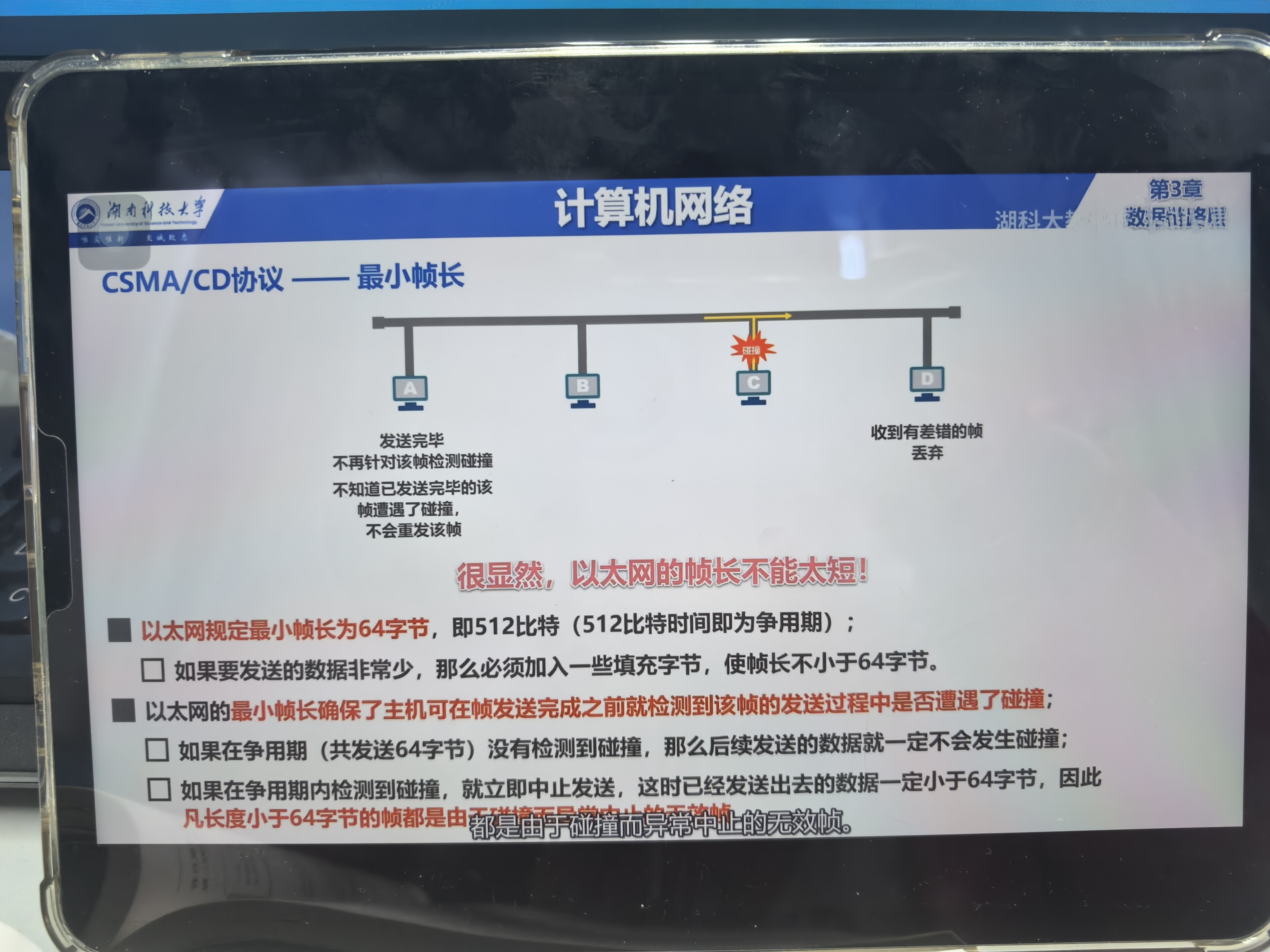 主机a给主机d发很短的帧,边发送边检测碰撞,发送完毕之后就不再检测,但不检测我自己就不知道我收到了没。