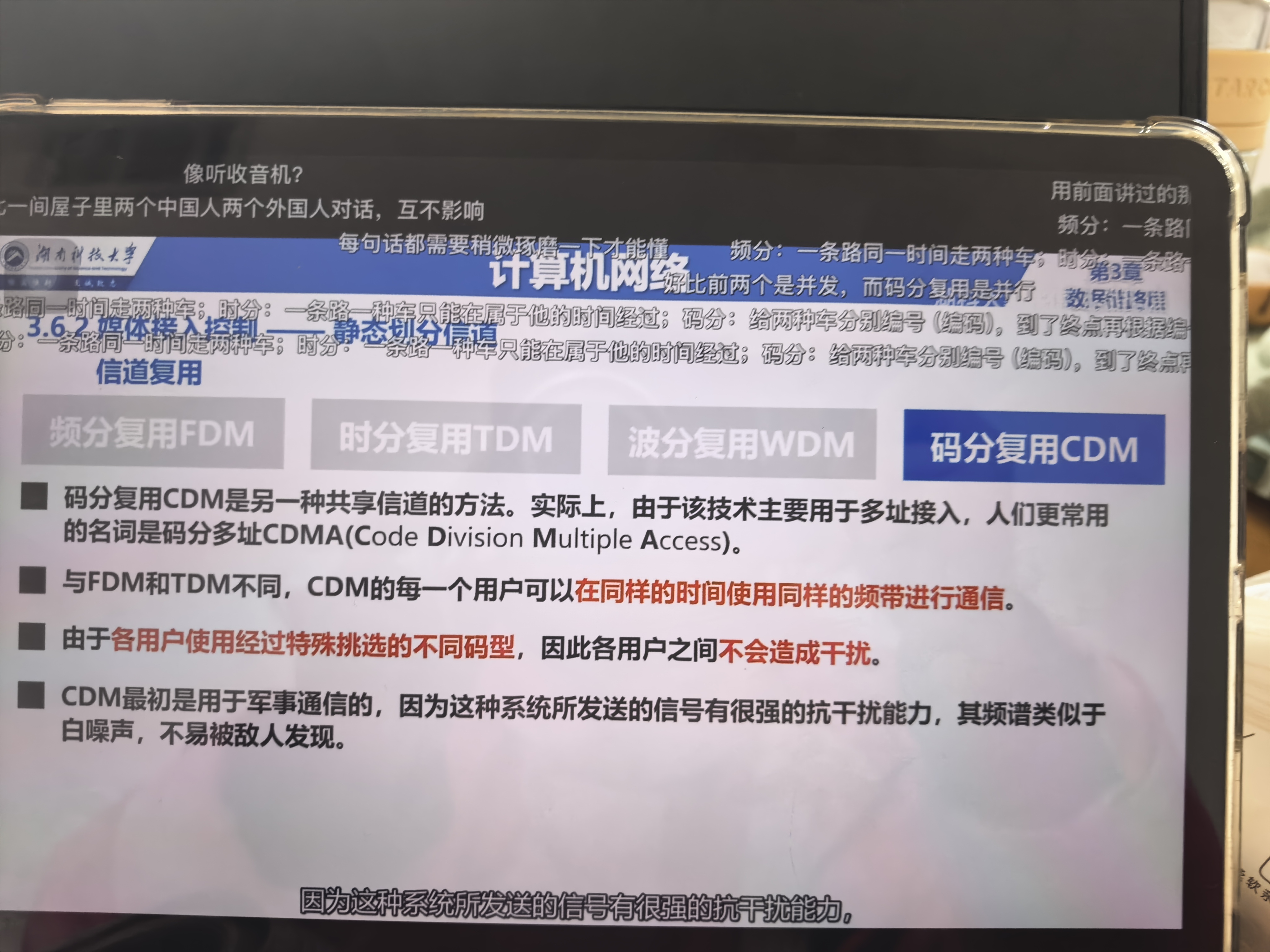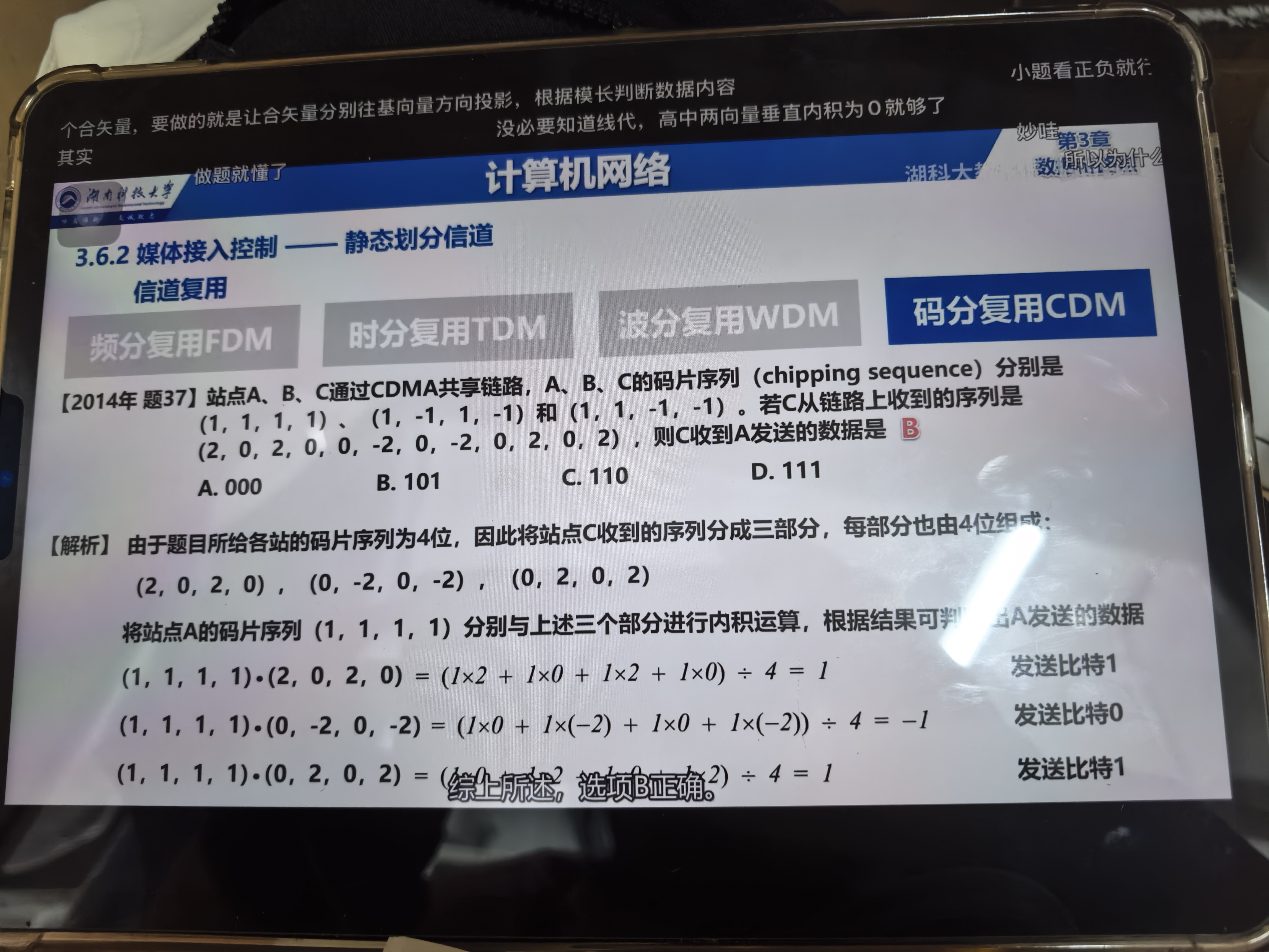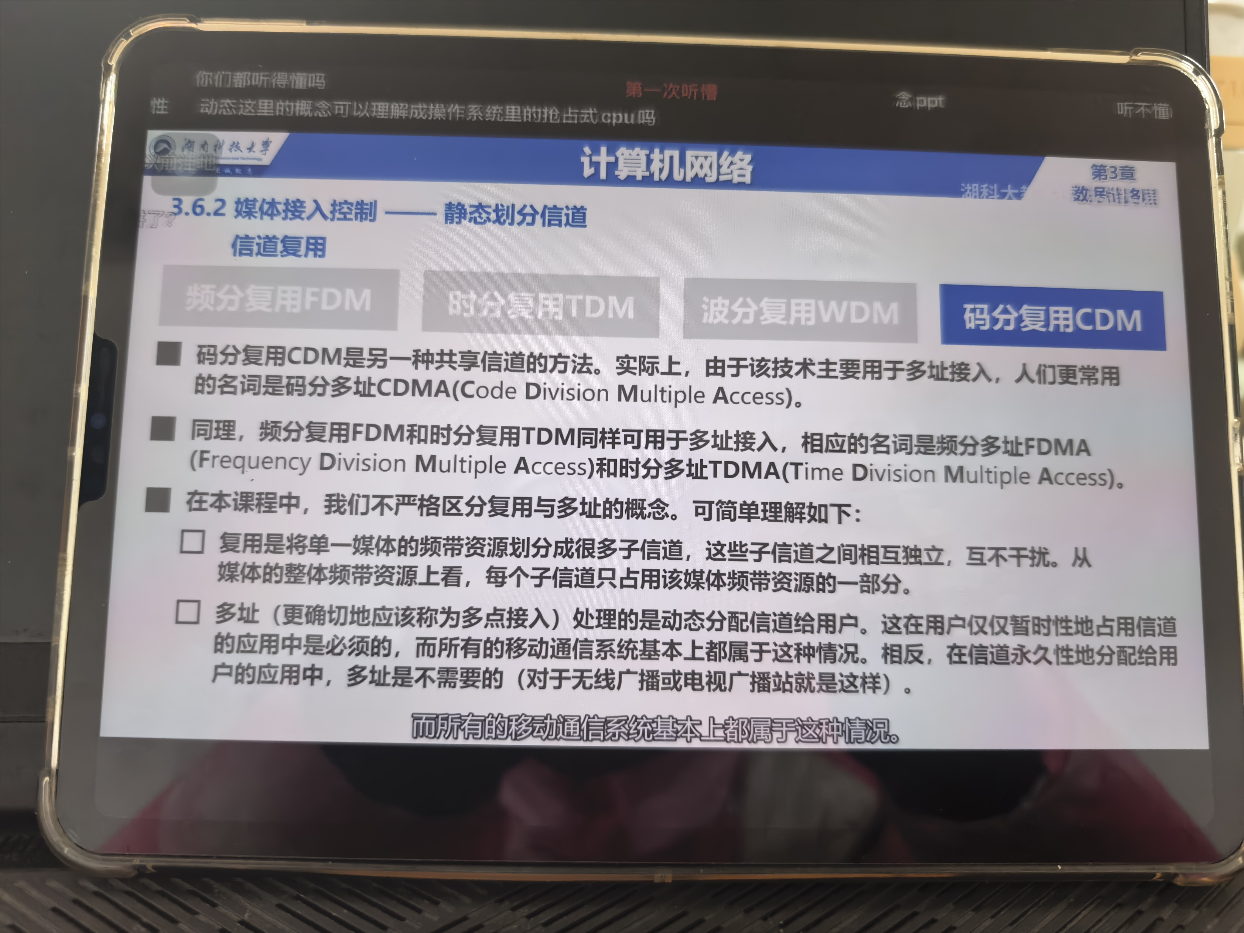 但对码分复用的理解不太准确——它不是“结合前两者”,而是完全不同的思路:大家既不用分频率,也不用分时间,是“同一时间、同一频率里,靠各自唯一的‘码片暗号’来区分自己的信号”,和前两者的“切分资源”逻辑不一样~