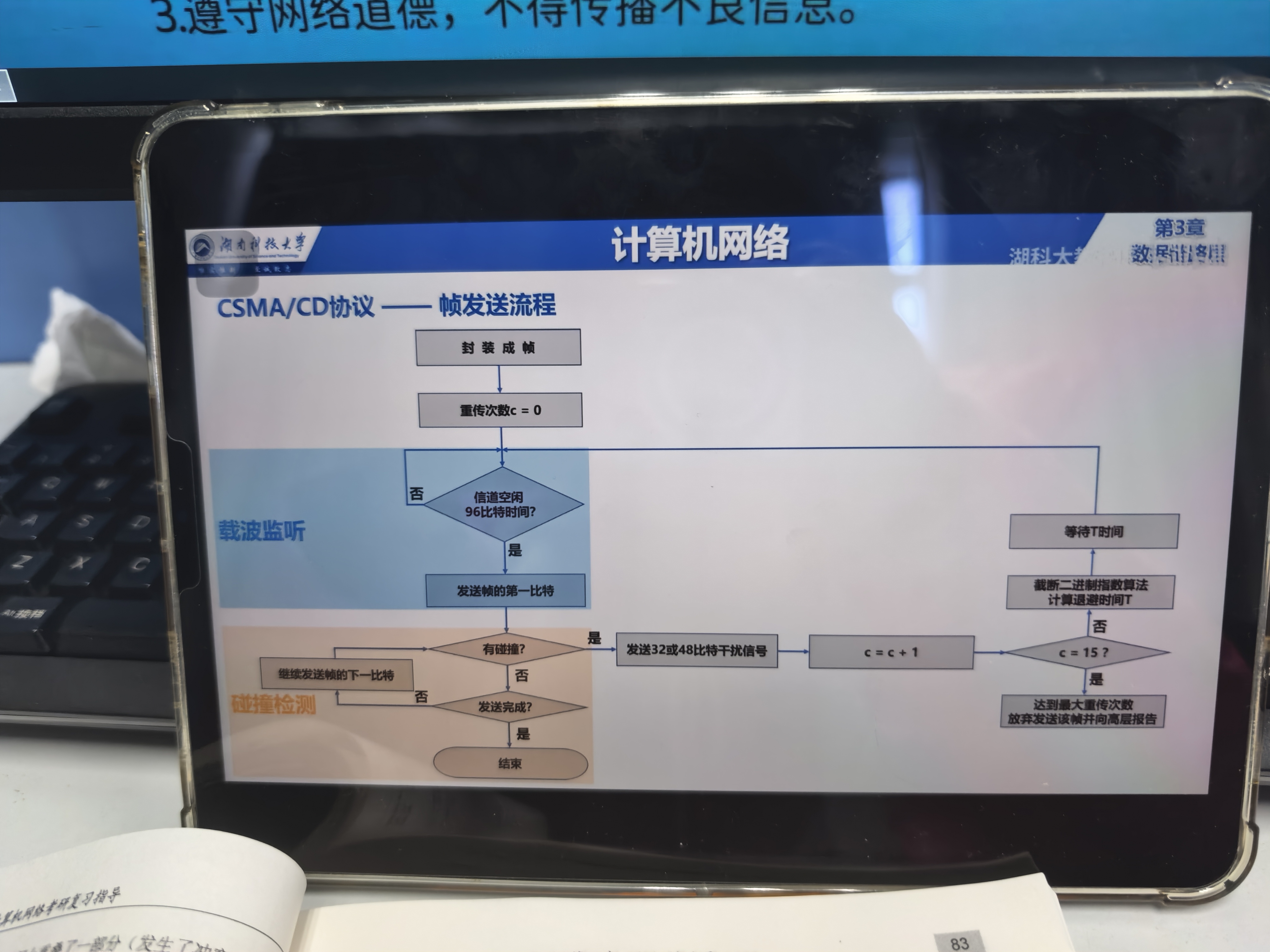 2. 发送中持续检测:从发送第一个比特开始,持续监听信道,直到帧的所有比特发送完成前——如果在发送过程中检测到碰撞,会立即停止;如果直到发送完成都没碰撞,就说明这次发送成功了。