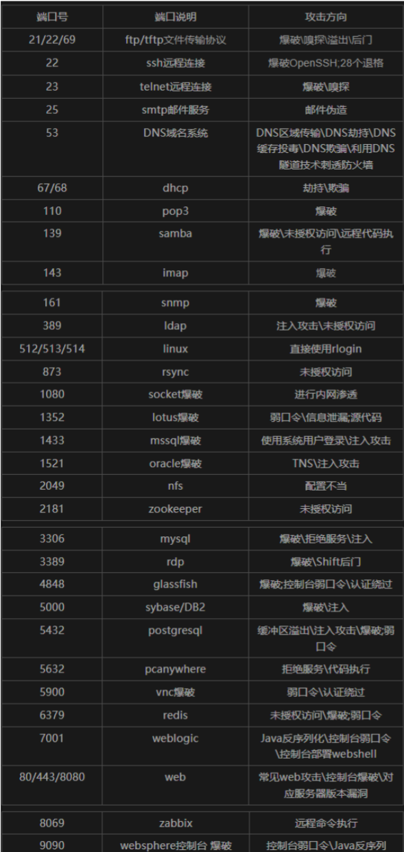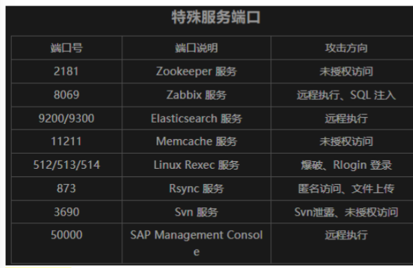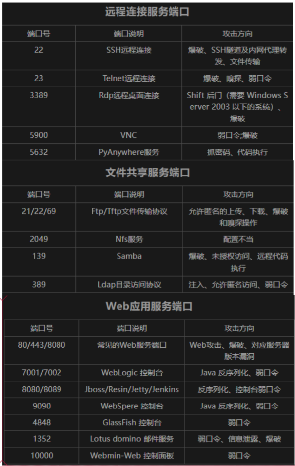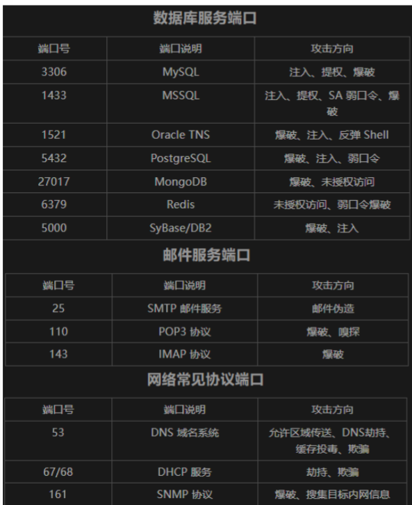2.对象类别:对服务进行类别划分,通过服务功能理解,如数据库有账号密码就会有爆破利用方法,也可以针对服务公开 的CVE进行漏洞测试以及服务常见的错误安全配置导致的未授权访问等