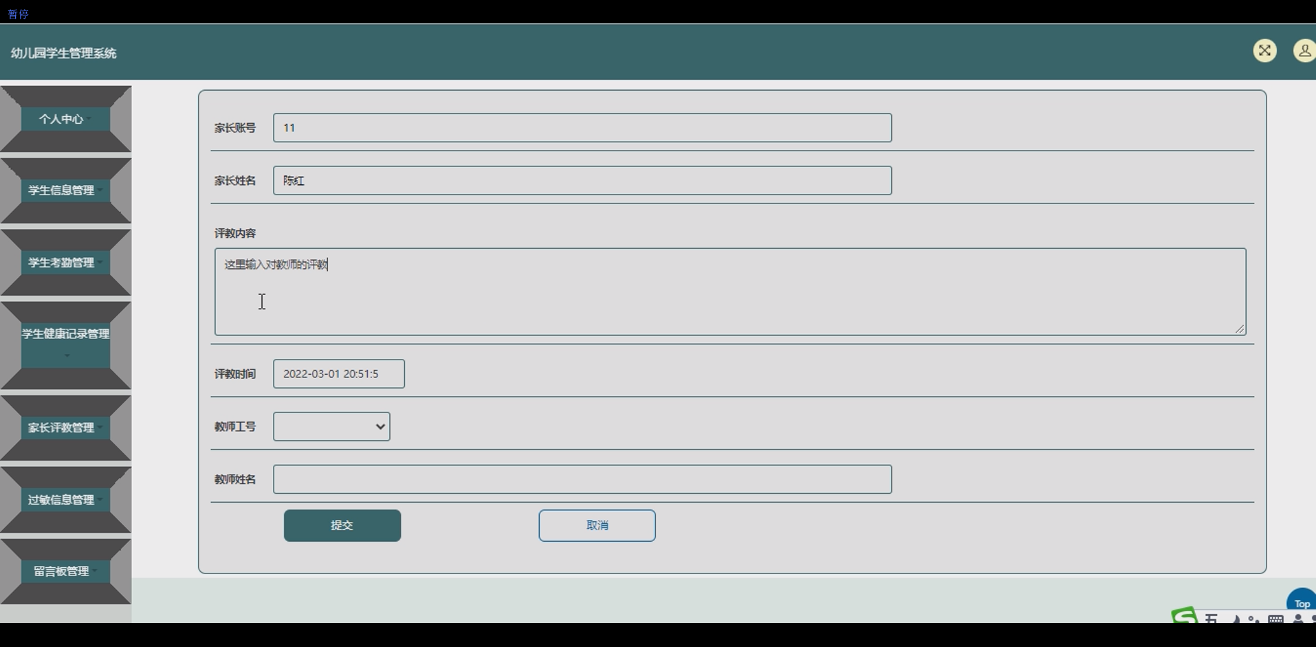 家长定期(如每月、每学期)对教师的教学态度、教学方法、教学效果以及幼儿园的管理服务质量等进行评价。评教采用星级评分和文字评价相结合的方式,家长完成评教后,系统会自动统计评教结果,并生成评教报表,管理员和教师可查看评教结果,了解家长对教学和管理工作的意见和建议,针对性地改进教学方法和管理措施。